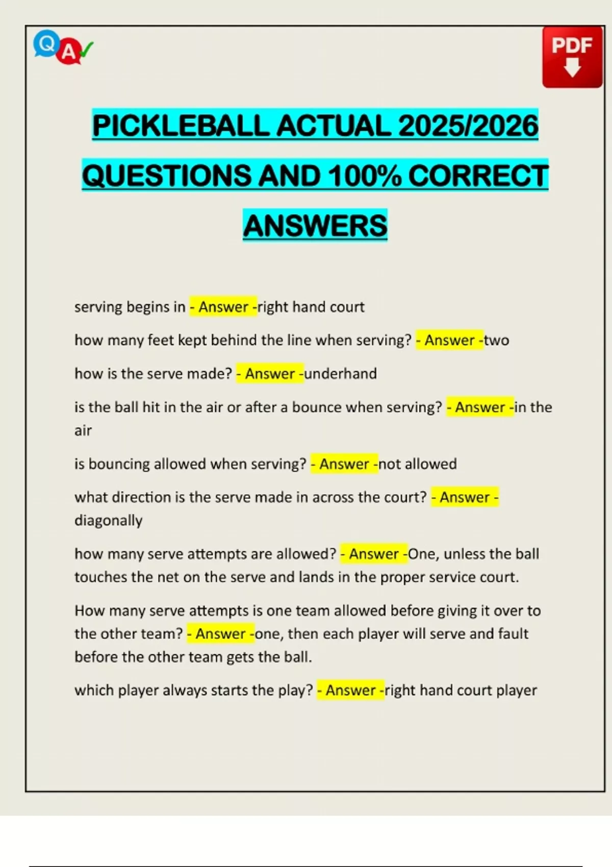 PACKAGE DEAL::: PICKLEBALL EXAMS 2025/2026 Q&A 100% PASS
