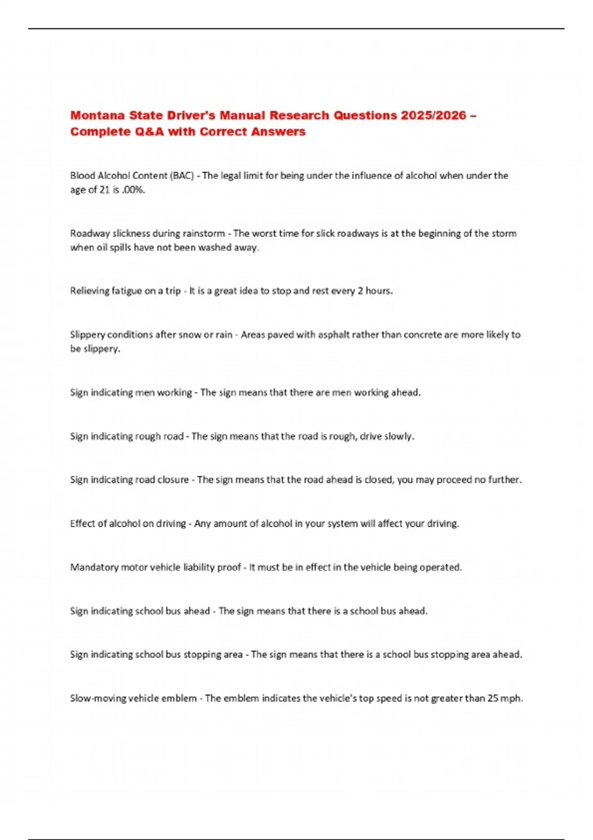 Montana State Driver's Manual Research Questions 2025/2026 – Complete Q&A with Correct Answers
