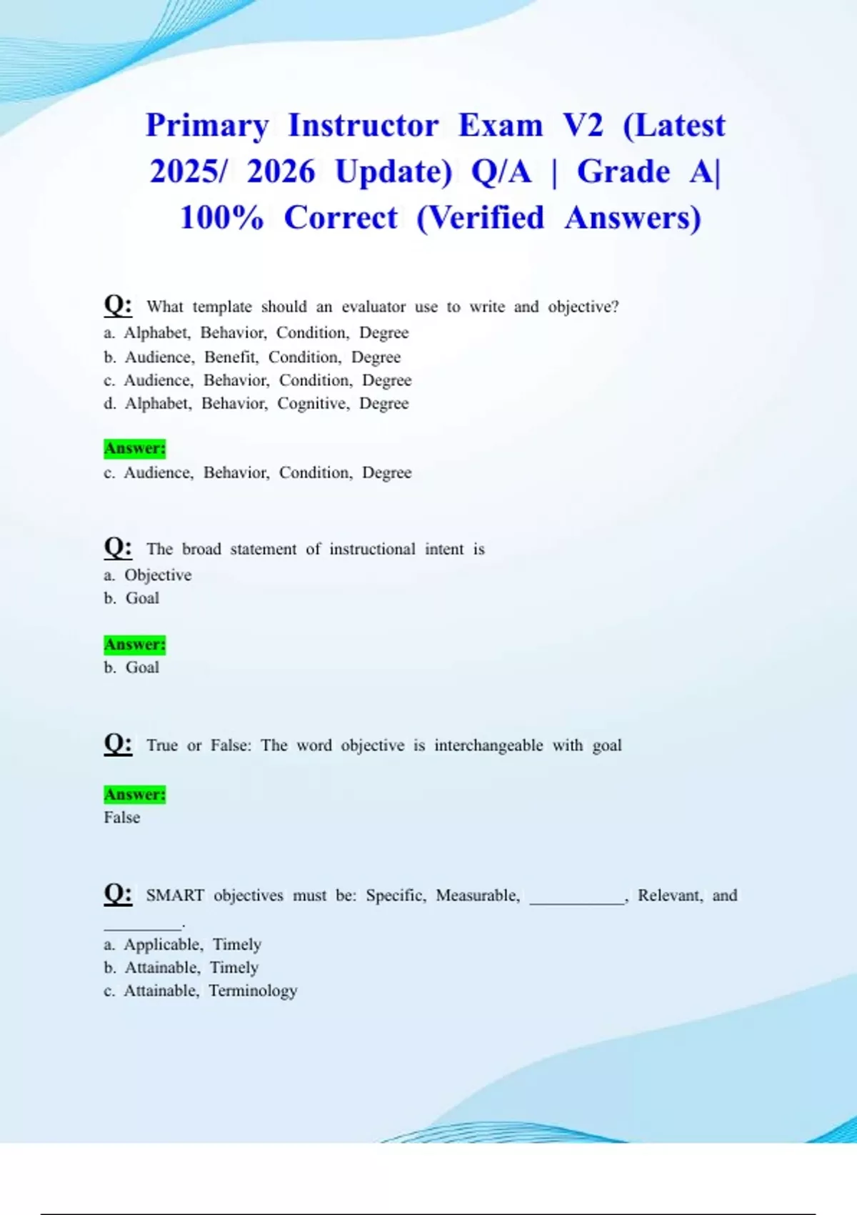 Primary Instructor Exam V2 (Latest 2025/ 2026 Update) Q/A | Grade A| 100% Correct (Verified Answers)