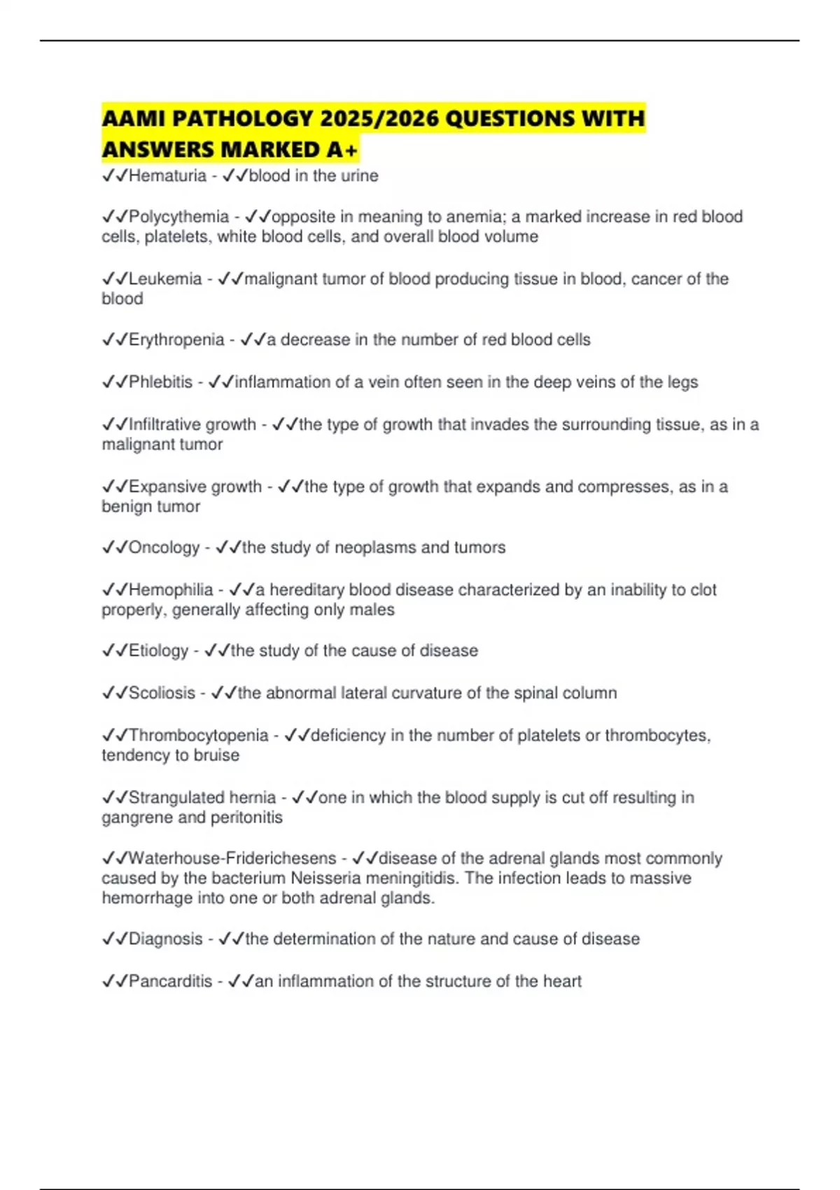 AAMI PATHOLOGY 2025/2026 QUESTIONS WITH ANSWERS MARKED A+ Exam (elaborations) AAMI PATHOLOGY COMPREHENSIVE EXAM 2025/2026 QUESTIONS WITH ANSWERS MARKED A+