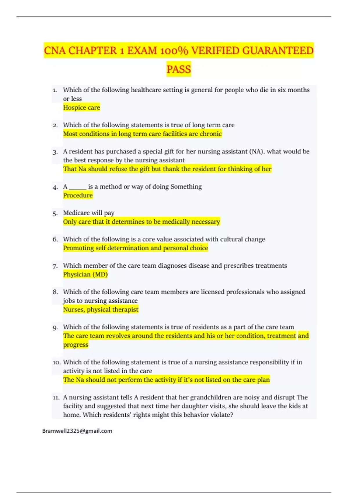CNA - Certified Nursing Assistant Chapters 1, 2, 3, 4, 5, 6, 7, 8, 9, & 10 Exam Questions and Revised Answers (2024 / 2025) 100% Guarantee Pass