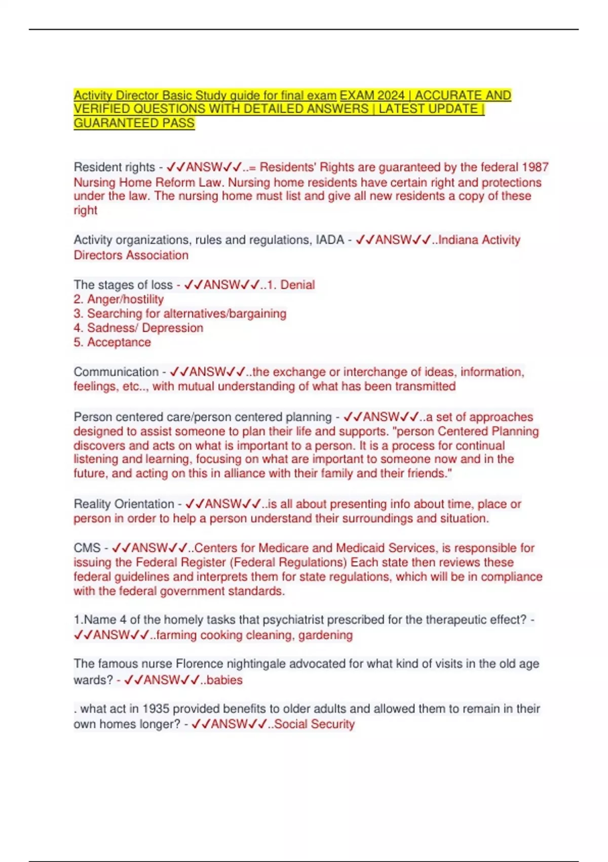 Activity Director Basic Study guide for final exam EXAM 2024 | ACCURATE AND VERIFIED QUESTIONS WITH DETAILED ANSWERS | LATEST UPDATE | GUARANTEED PASS