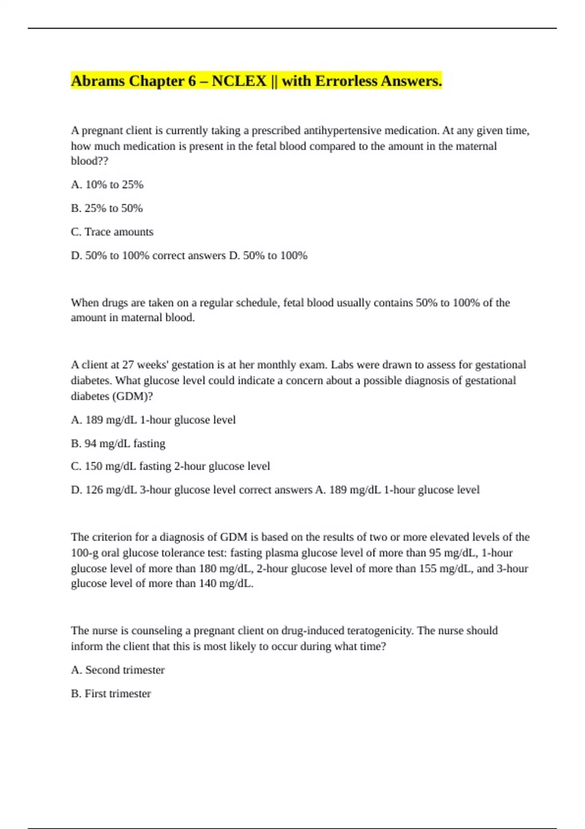 NCLEX Abrams Clinical Drug Therapy || All Solved. Abrams Chapter 6 – NCLEX || with Errorless Answers. Abrams Chapter 15 – NCLEX || Get it Correct. Abrams Chapter 18 – NCLEX || Errorless Answers 100%. Abrams NCLEX Questions Chapters 47-48, 53-58 || 100% no Error.