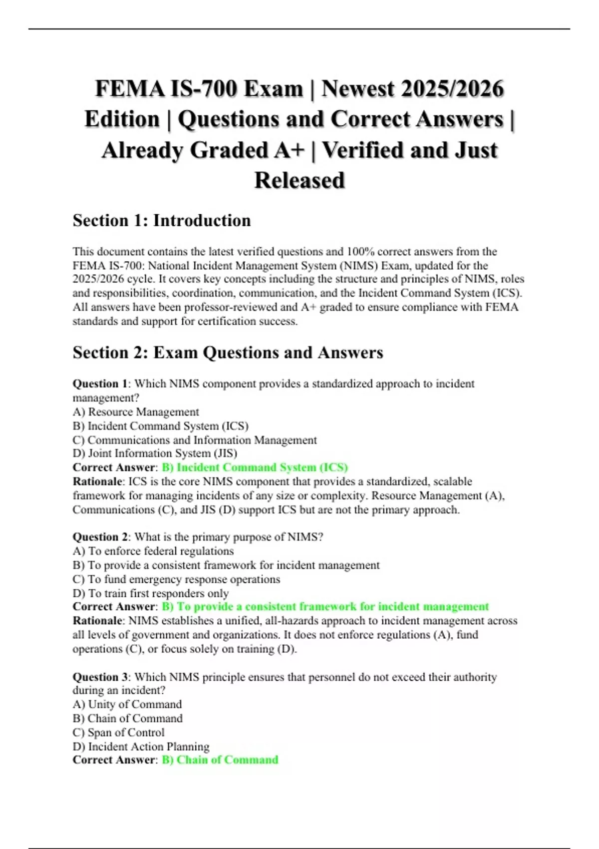 This all-inclusive package deal contains the full set of NIMS and FEMA Incident Command System certification exams for the 2025/2026 edition — ICS-100, ICS-200, ICS-300, ICS-400, IS-700.B, and ICS-800.D. Each exam features real, expert-verified questions with 100% correct answers. Content covers foundational ICS principles, leadership & delegation