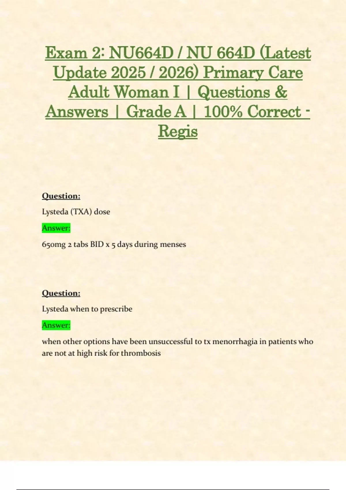 Exam 2 & Final Exam : NU 664D / NU664D (Latest 2025 / 2026 Updates STUDY BUNDLE PACKAGE WITH SOLUTIONS) Primary Care Adult Woman I | Questions & Answers | Grade A | 100% Correct (Verified Solutions) - Regis