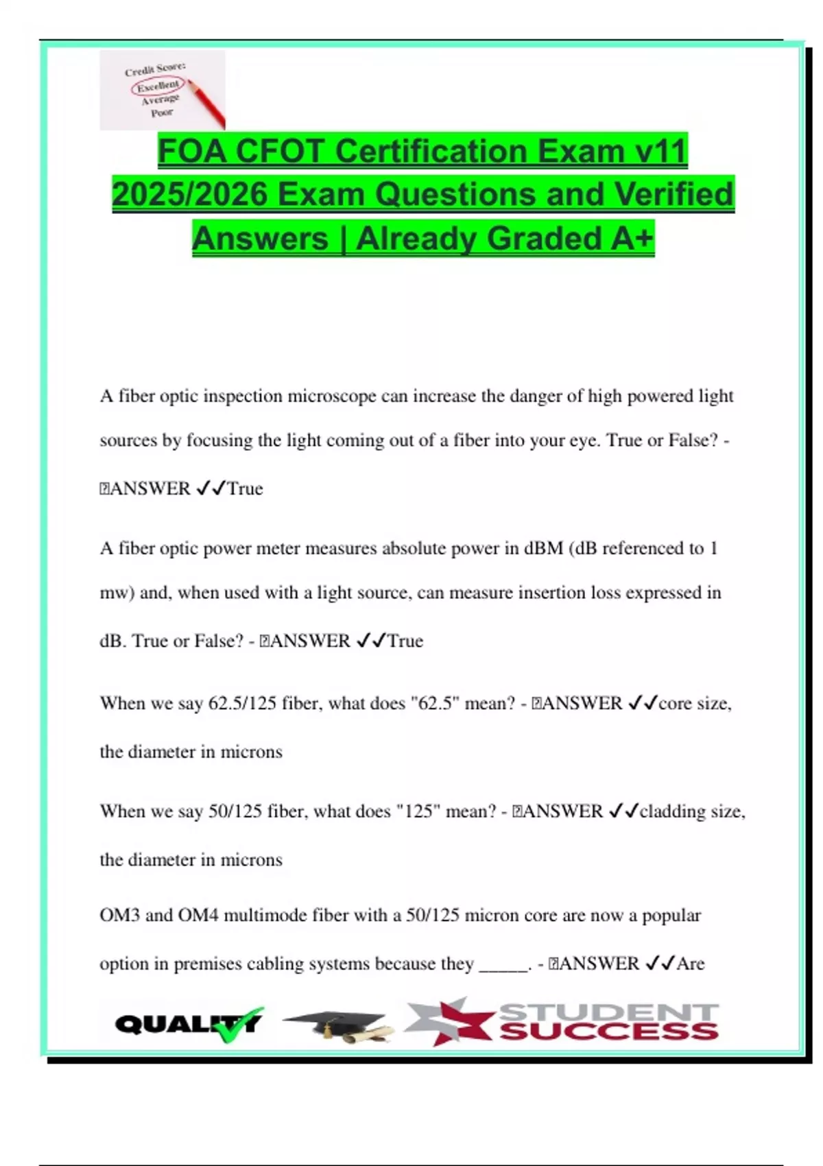 FOA CFOT Certification Exam v11 (2025/2026) – 100 Verified Questions & Answers – Fiber Types, Cable Design, OTDR, Safety & Testing Tools