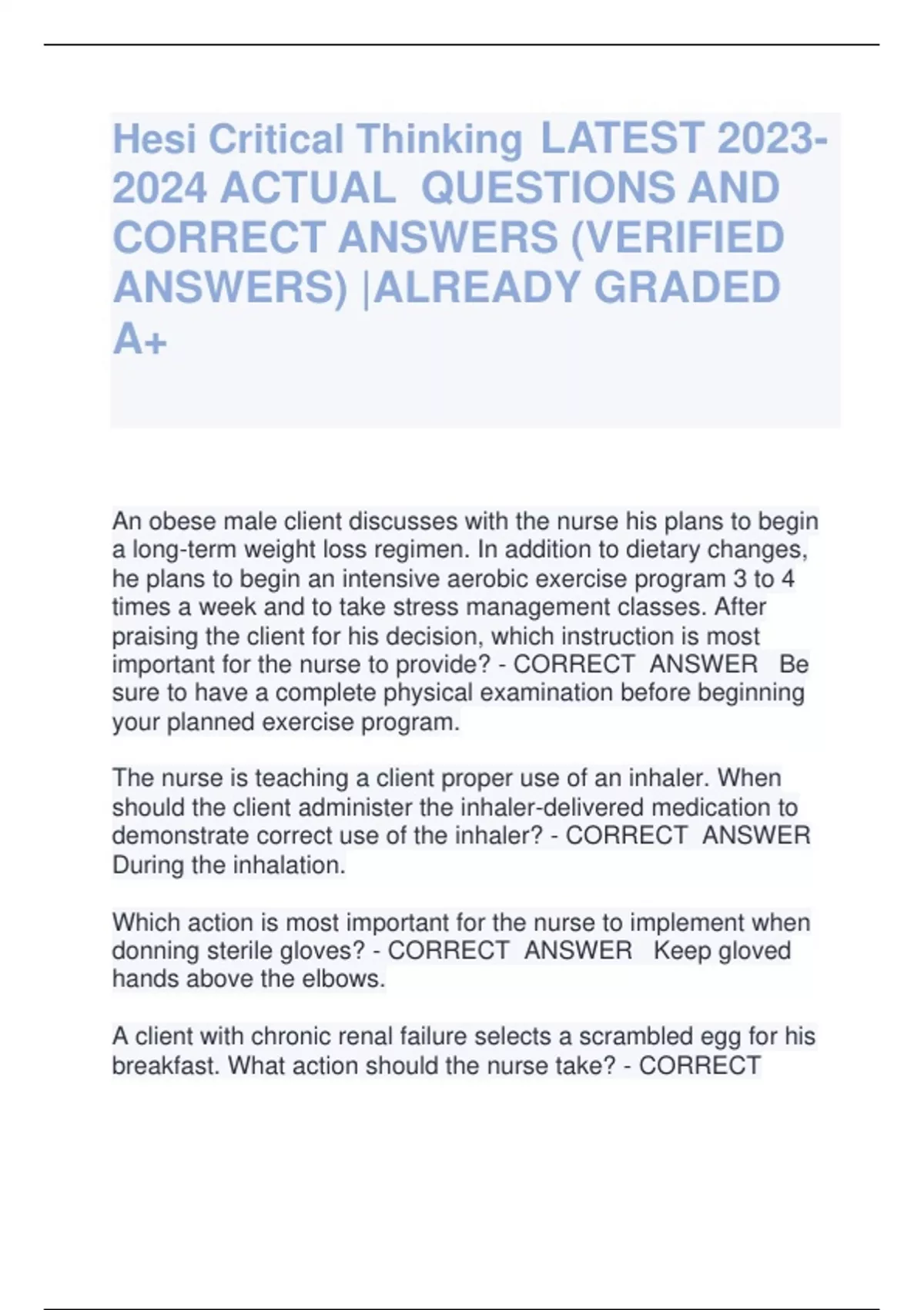 Hesi critical thinking LATEST ACTUAL QUESTIONS AND CORRECT ANSWERS (VERIFIED ANSWERS) |ALREADY GRADED A+