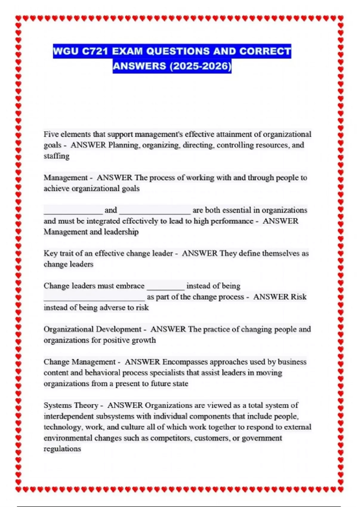 WGU C721 CHANGE MANAGEMENT EXAM QUESTIONS AND VERIFIED ANSWERS