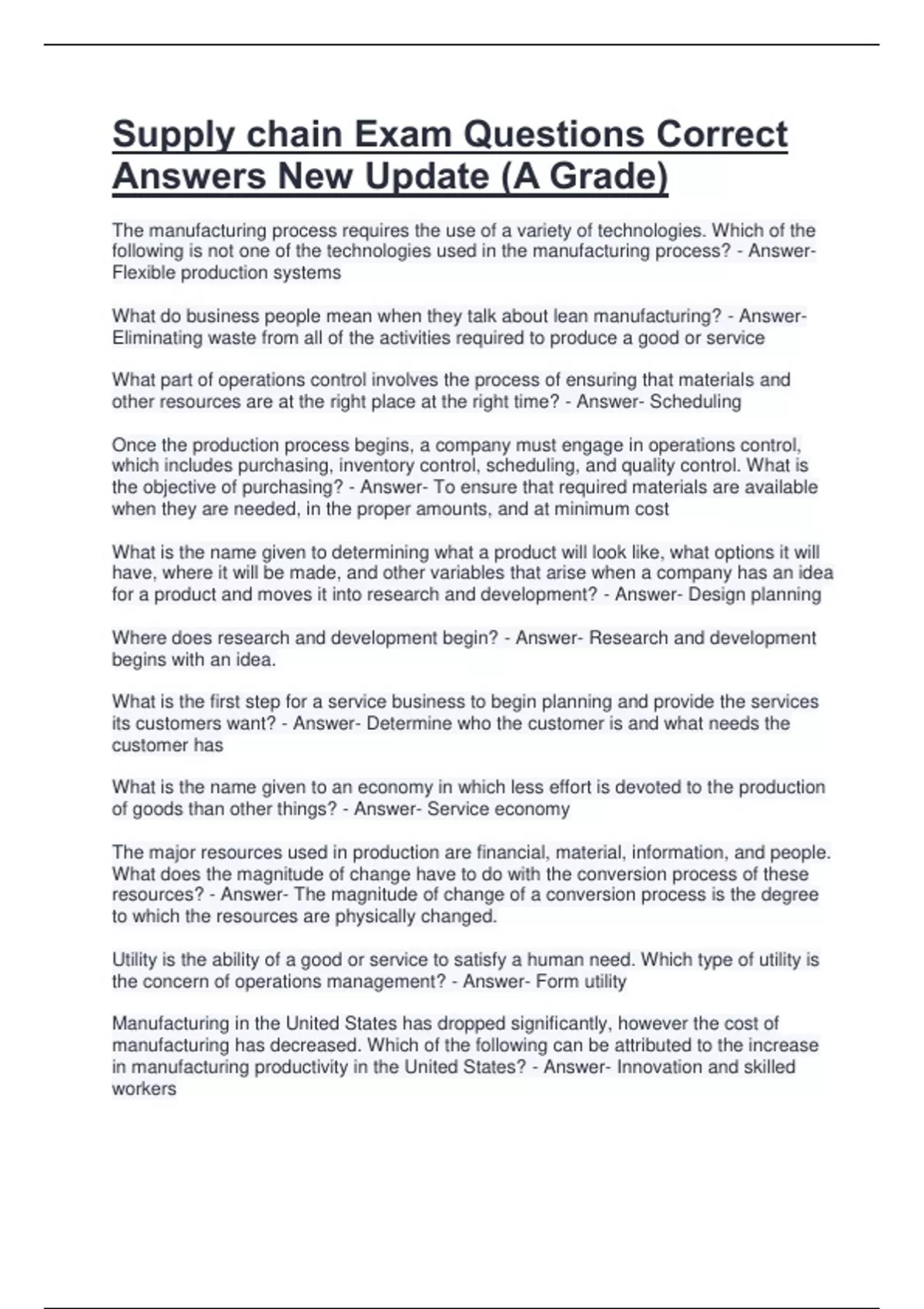 1 Exam (elaborations) Supply Chain 1 Exam Questions Correct Answers New Update (A Grade) 2 Exam (elaborations) SUPPLY CHAIN FOUNDATIONS EXAM QUESTIONS CORRECT VERIFIED ANSWERS NEW UPDATE 3 Exam (elaborations) Supply Chain EXAM VERIFIED | LATEST UPDATE 4 Exam (elaborations) Supply chain Exam Real Exam Questions With 100% Correct Answers