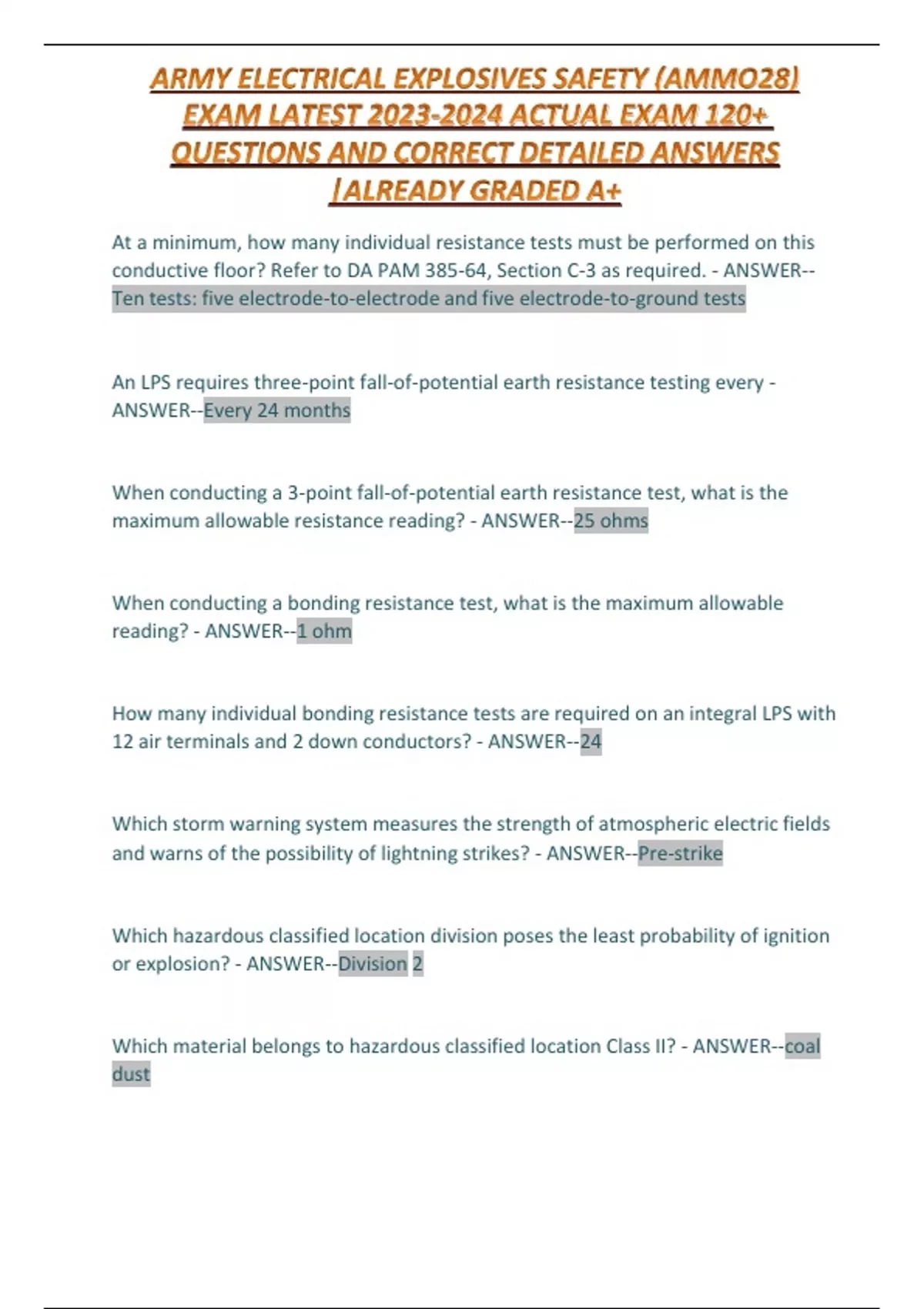 ARMY ELECTRICAL EXPLOSIVES SAFETY (AMMO28) EXAM LATEST ACTUAL EXAM 120+ QUESTIONS AND CORRECT DETAILED ANSWERS |ALREADY GRADED A+