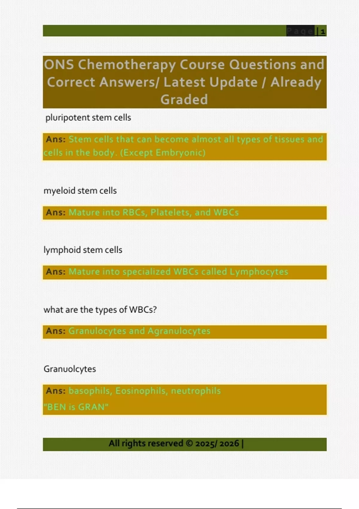 ONS Chemotherapy Questions and Correct Answers/ Latest Update / Already Graded