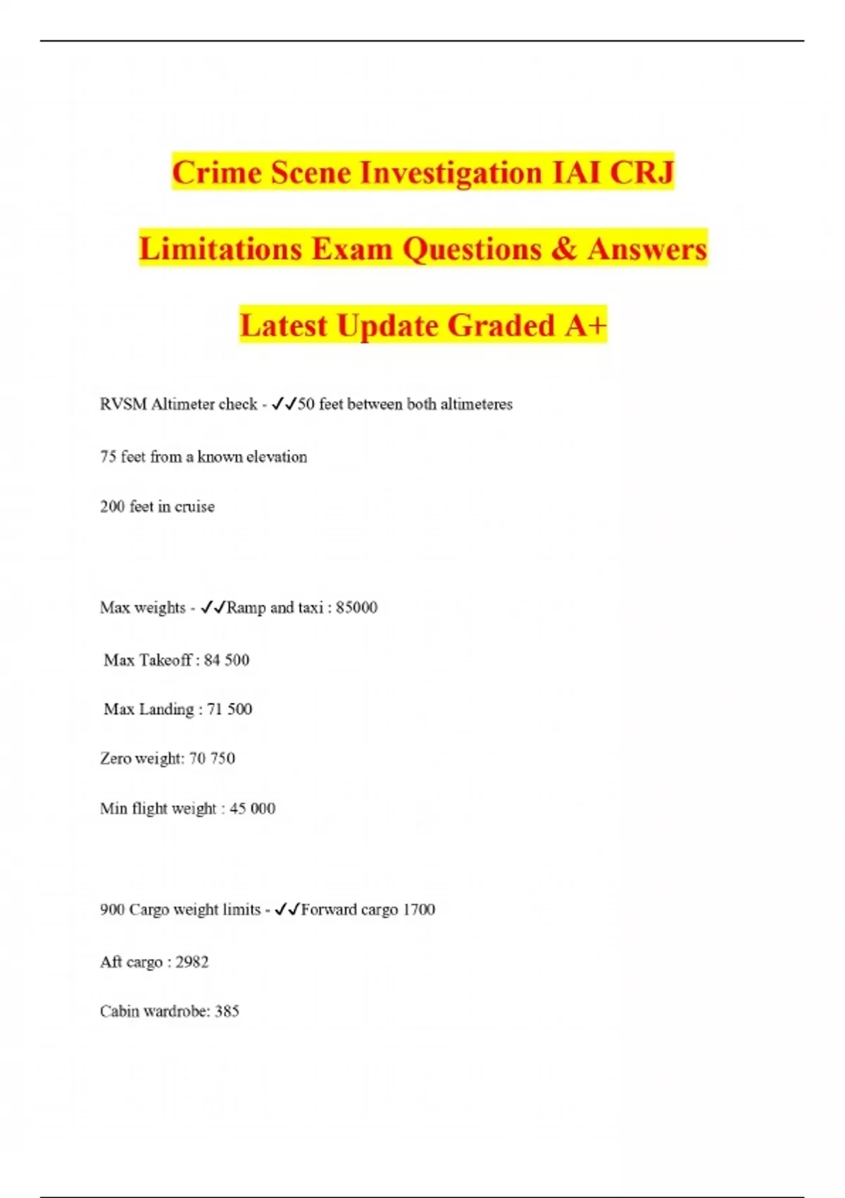 Crime Scene Investigation IAI CRJ Limitations Exam Questions & Answers Latest Update Graded A+ Maximum crosswind for takeoff and landing? - 27 knots