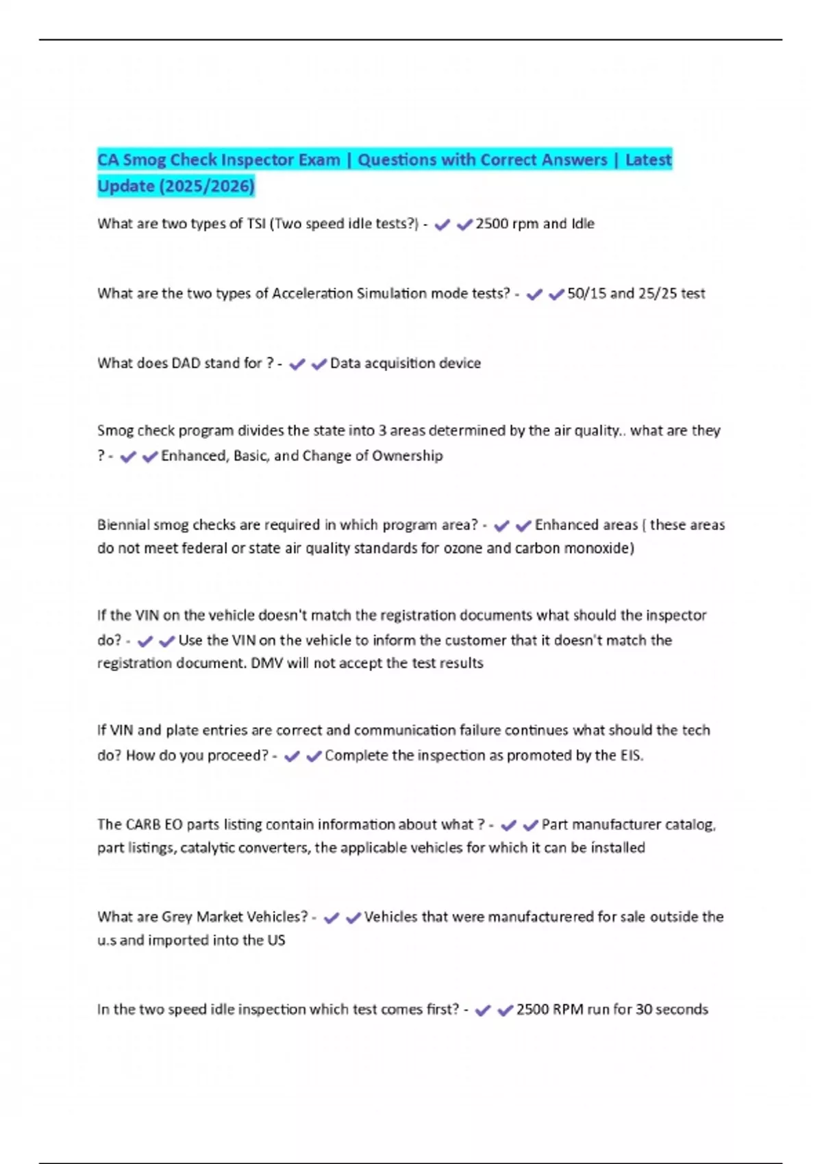 CA Smog Check Inspector Exam | Questions with Correct Answers | Latest Update (2025/2026)