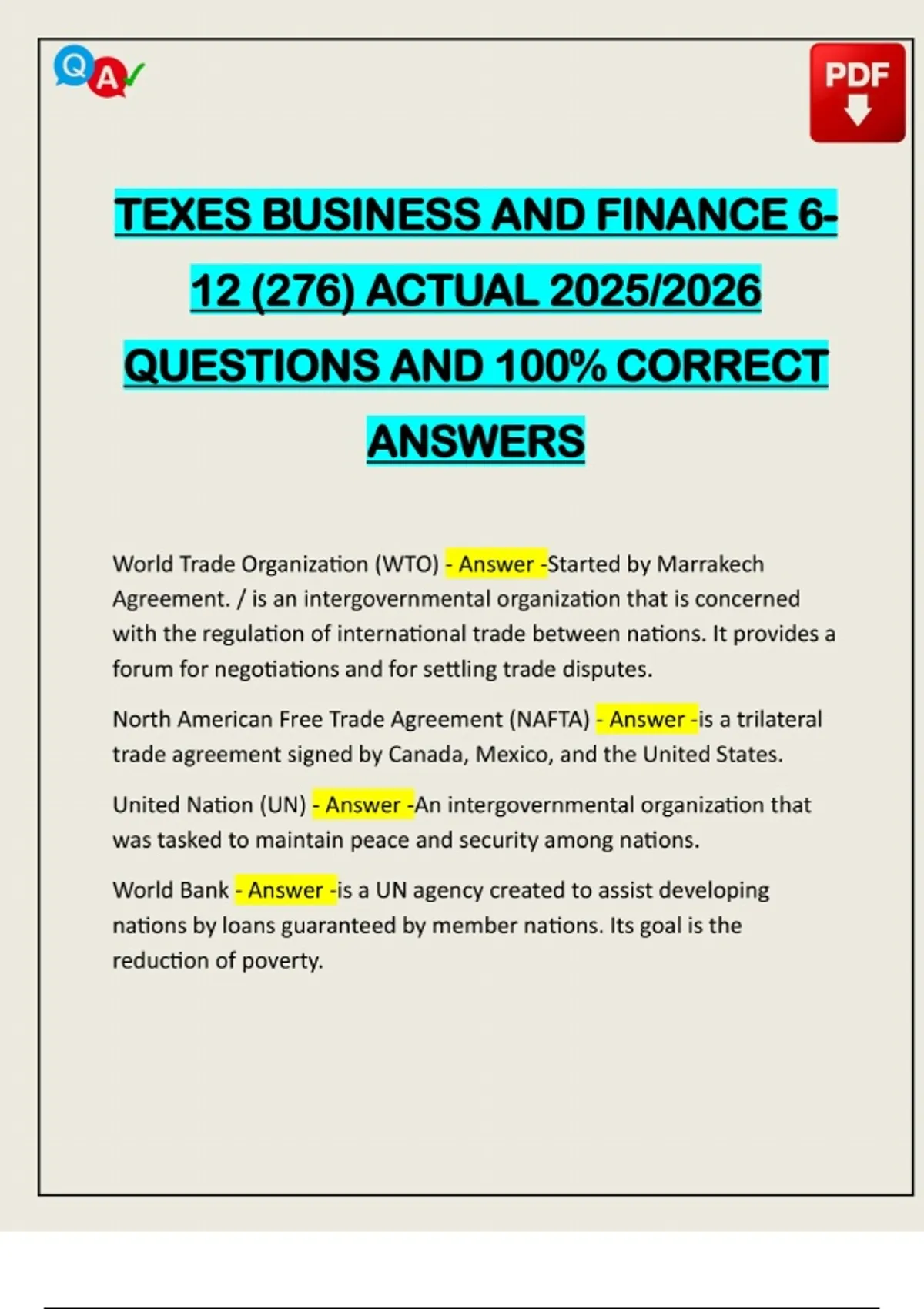 EXAMS PACK::: TEXES, TEXAS BUSINESS & FINANCE 6-12 (276) ACTUAL 2025/2026 Q&A 100% PASS