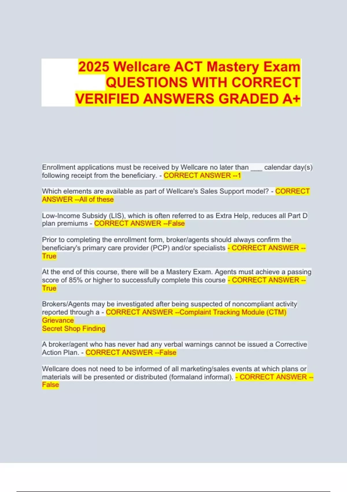 Wellcare ACT Mastery Exam QUESTIONS WITH CORRECT VERIFIED ANSWERS GRADED A+