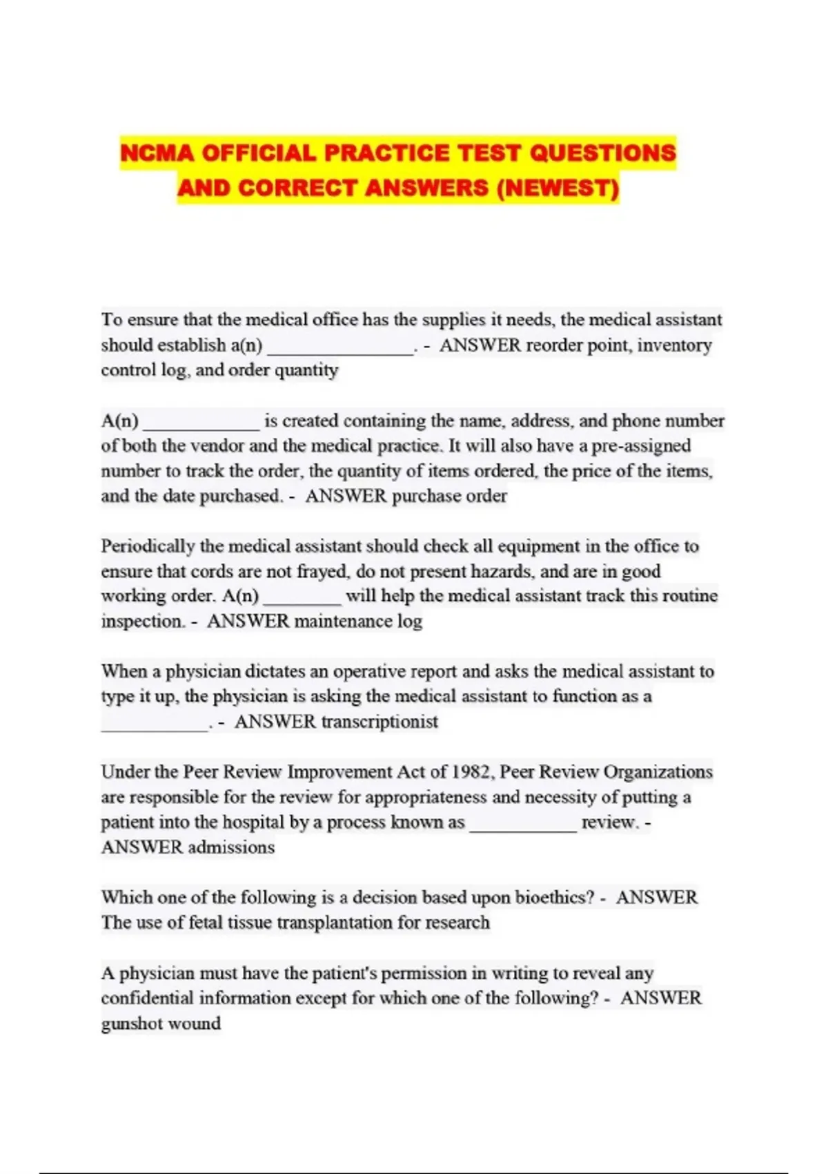 NCMA OFFICIAL PRACTICE TEST QUESTIONS AND CORRECT ANSWERS (NEWEST)