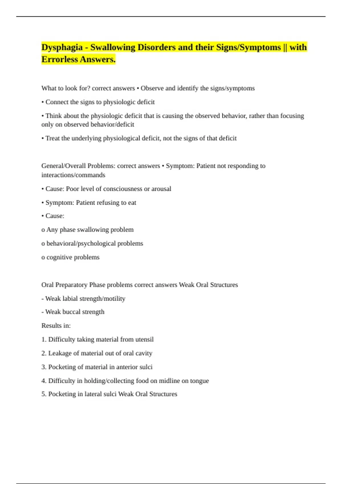 Dysphagia Anatomy and Physiology || Answered Perfectly 100%. VOMITING AND DYSPHAGIA ||ANSWERS 100% RATED CORRECT. Unit 4: Causes of Dysphagia || 100% no Error. SLP 6055 - Dysphagia Midterm Study Guide Part I || with Errorless Answers. Oropharyngeal Dysphagia || with Certified Answers. NURSING STAFF AND DYSPHAGIA || 100% VERIFIED SOLUTIONS. Exam 3 D
