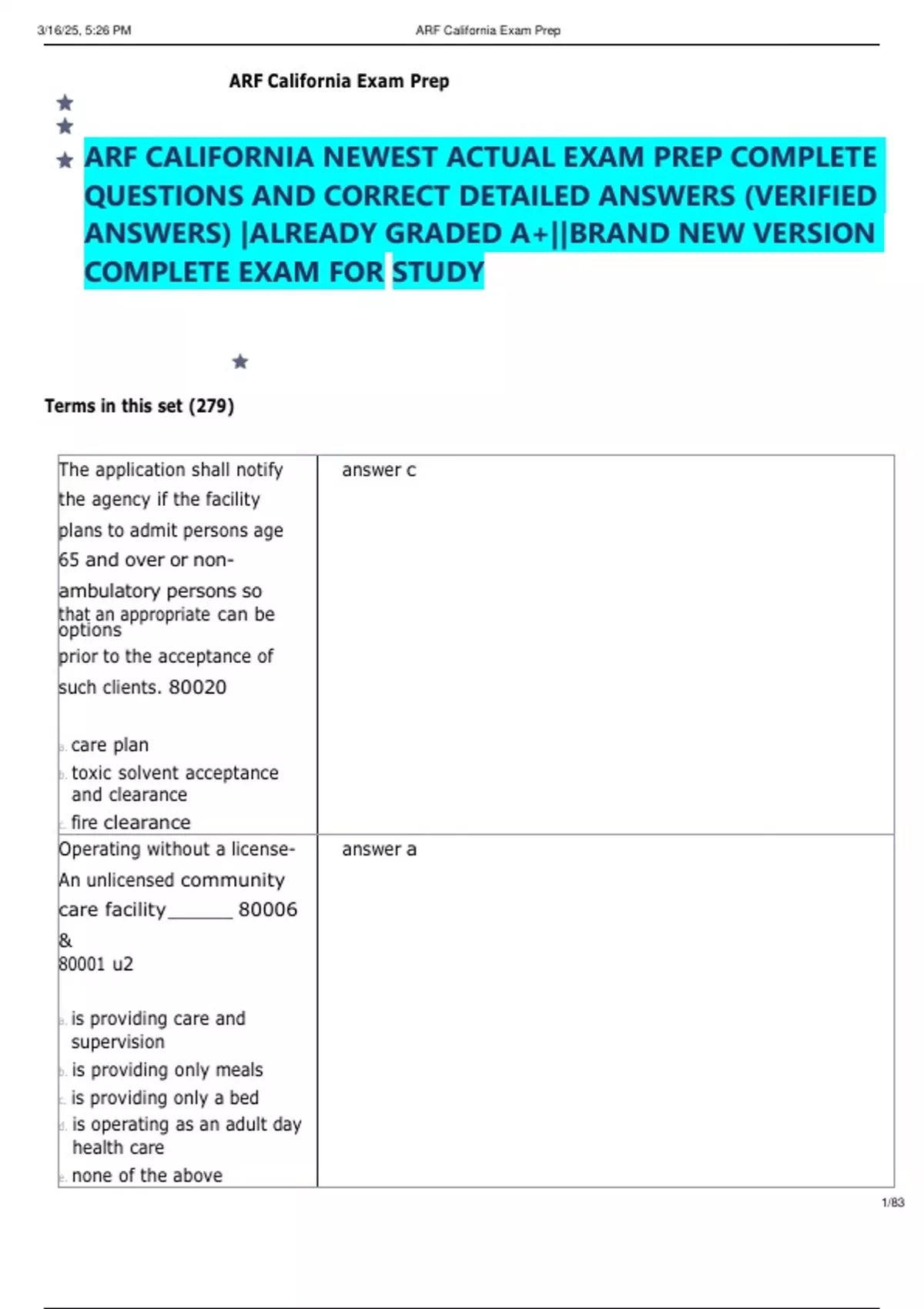 California ARF Administrator Actual Exam | UPDATE |ACTUAL EXAM QUESTIONS AND VERIFIED ANSWERS/ACCURATE SOLUTIONS |GET IT 100% CORRECT!! ALREADY GRADED A+ California ARF Administrator Actual Exam | UPDATE |ACTUAL EXAM QUESTIONS AND VERIFIED ANSWERS/ACCURATE SOLUTIONS |GET IT 100% CORRECT!! ALREADY GRADED A+ California ARF Administr