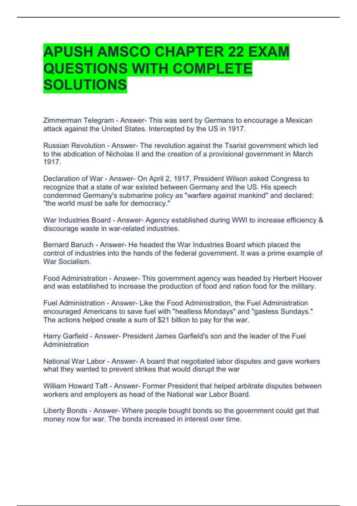 Bundle For APUSH AMSCO CHAPTER 22 EXAM QUESTIONS WITH COMPLETE SOLUTIONS