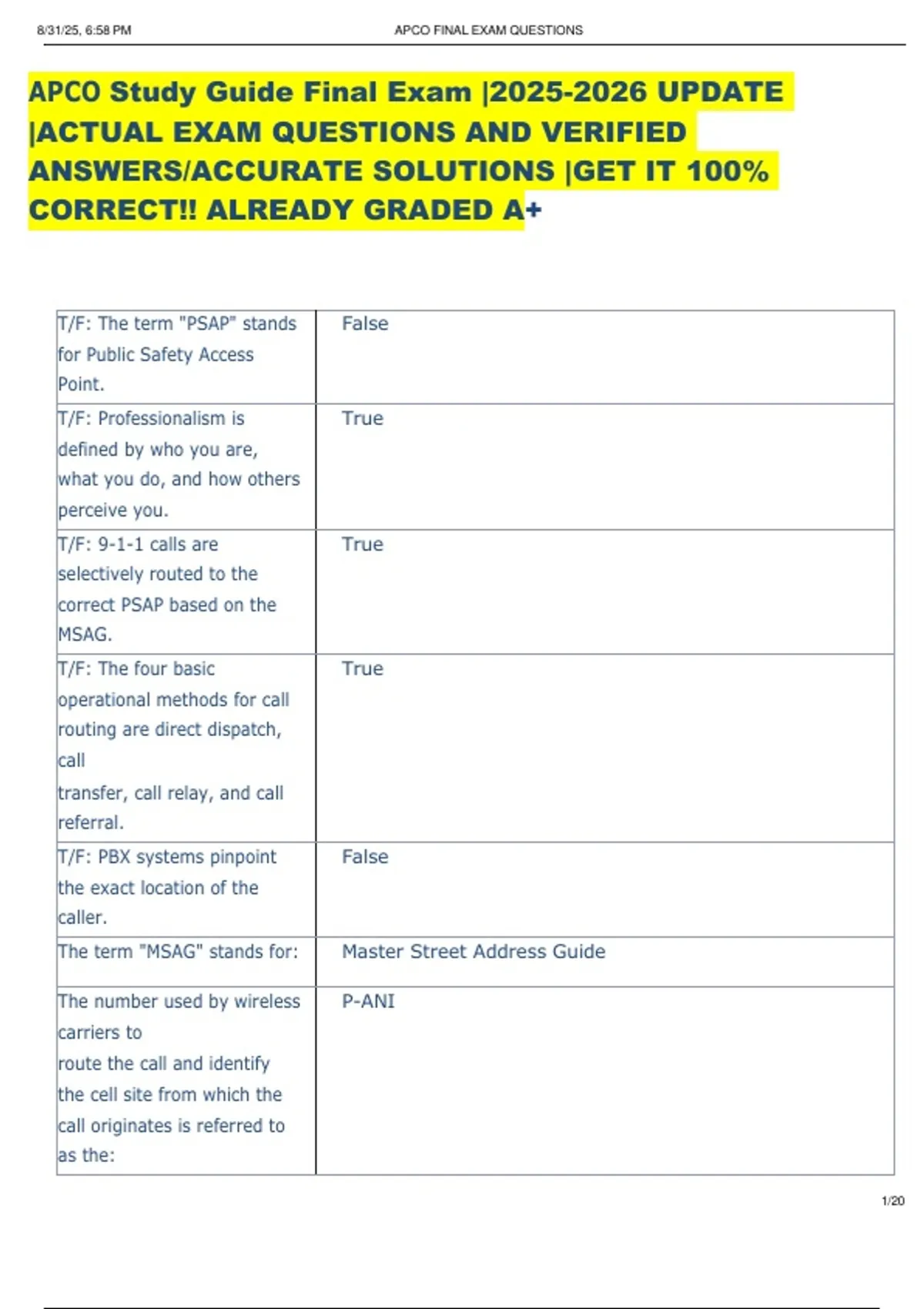 APCO EMDPST1 Study Guide Exam | UPDATE |ACTUAL EXAM QUESTIONS AND VERIFIED ANSWERS/ACCURATE SOLUTIONS |GET IT 100% CORRECT!! ALREADY GRADED A+ APCO EMDPST1 Study Guide Exam | UPDATE |ACTUAL EXAM QUESTIONS AND VERIFIED ANSWERS/ACCURATE SOLUTIONS |GET IT 100% CORRECT!! ALREADY GRADED A+ APCO EMDPST1 Study Guide Exam |