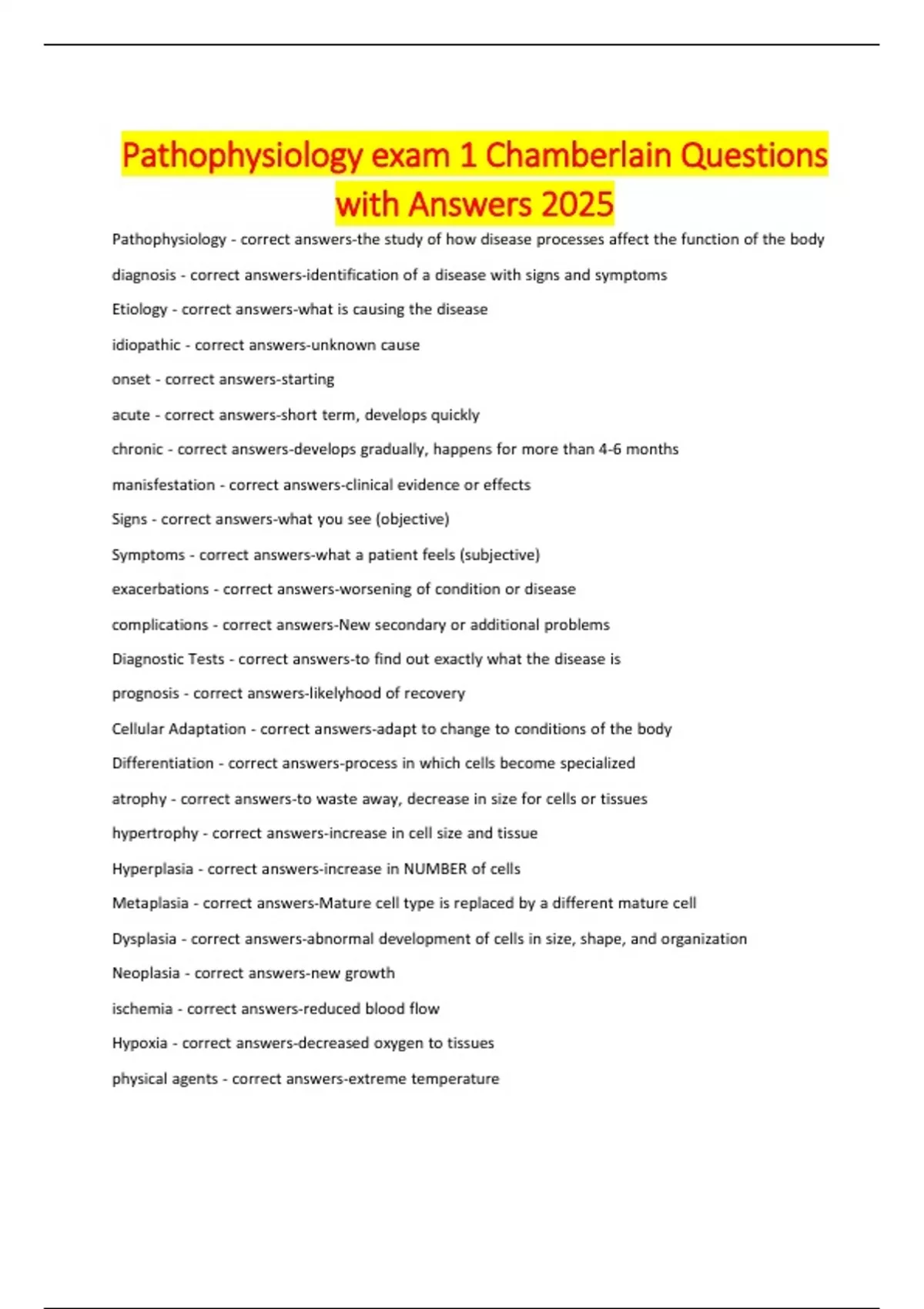Pathophysiology exam 1 Chamberlain Questions with Answers 2025