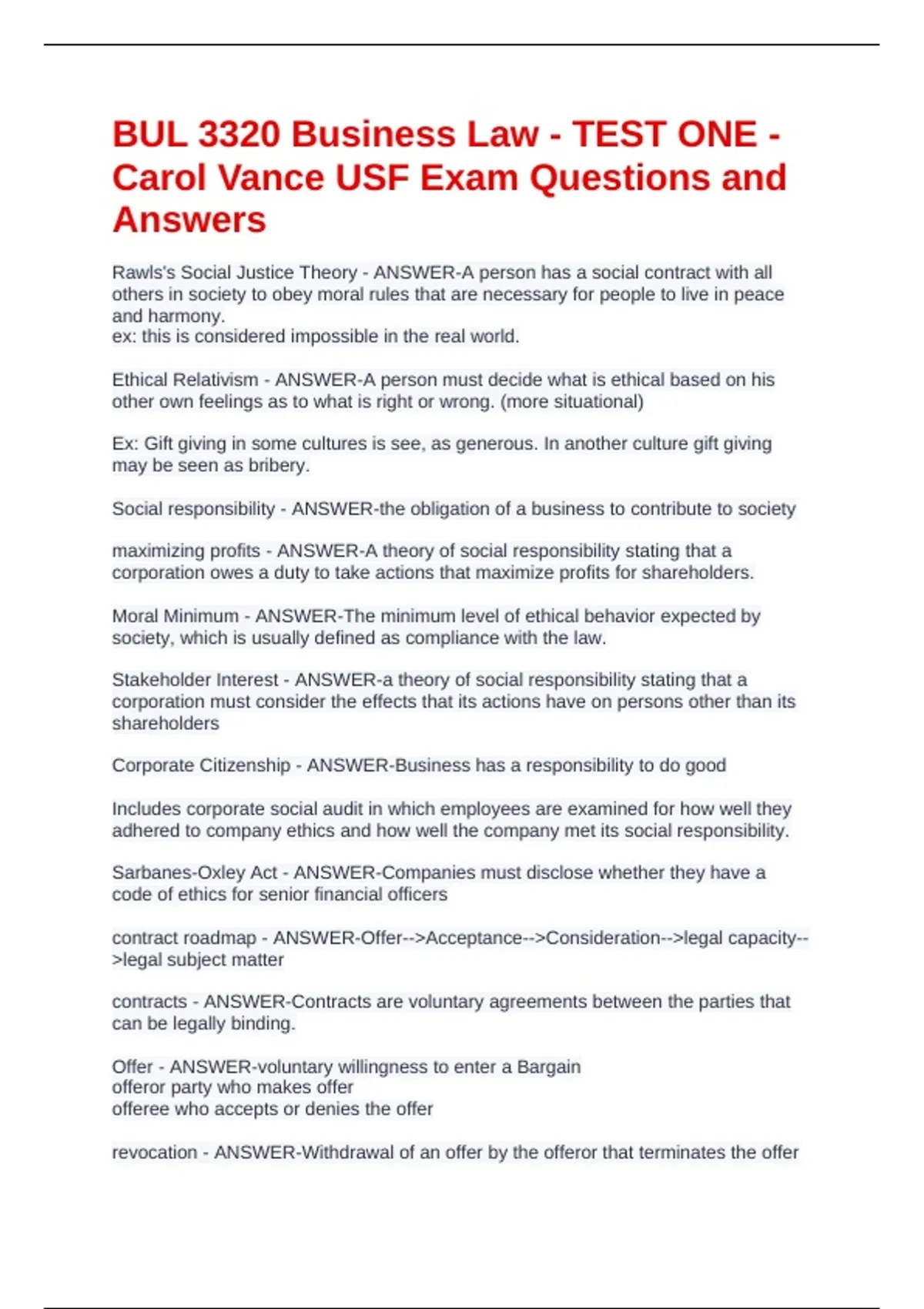 BUL 3320 Business Law - TEST ONE - Carol Vance USF Exam Questions and Answers