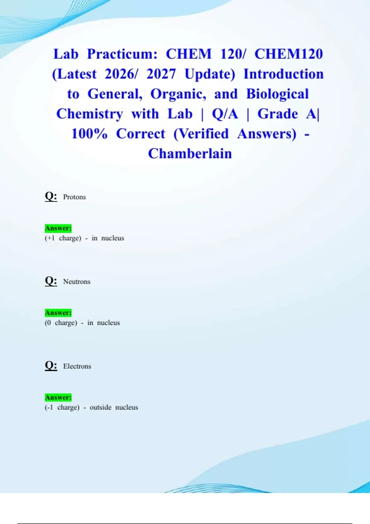 Lab Practicum: CHEM 120/ CHEM120 (Latest 2026/ 2027 Update) Introduction to General, Organic, and Biological Chemistry with Lab | Q/A | Grade A| 100% Correct (Verified Answers) -Chamberlain