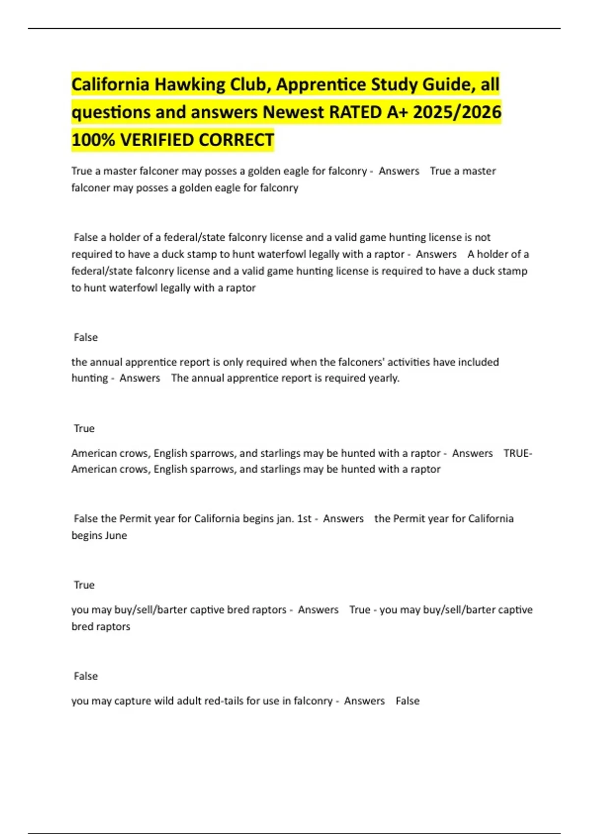 California Hawking Club, Apprentice Study Guide, all questions Exam Package Deal New!!