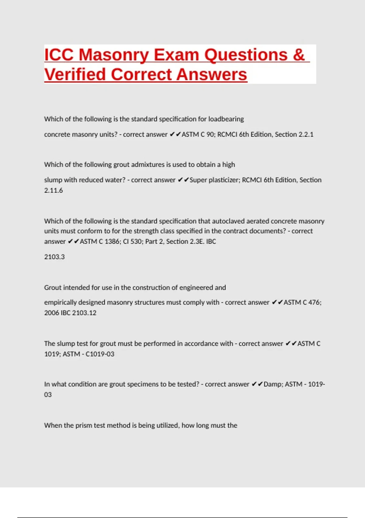 Summary ICC Masonry Exam Questions & Actual Correct Answers