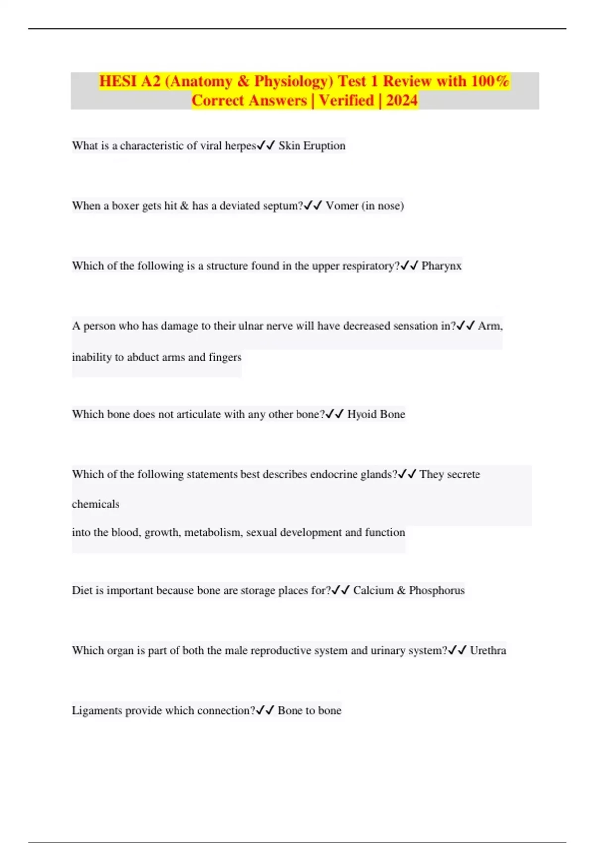HESI A2 (Anatomy & Physiology) Test 1 Review with 100% Correct Answers | Verified | 2024