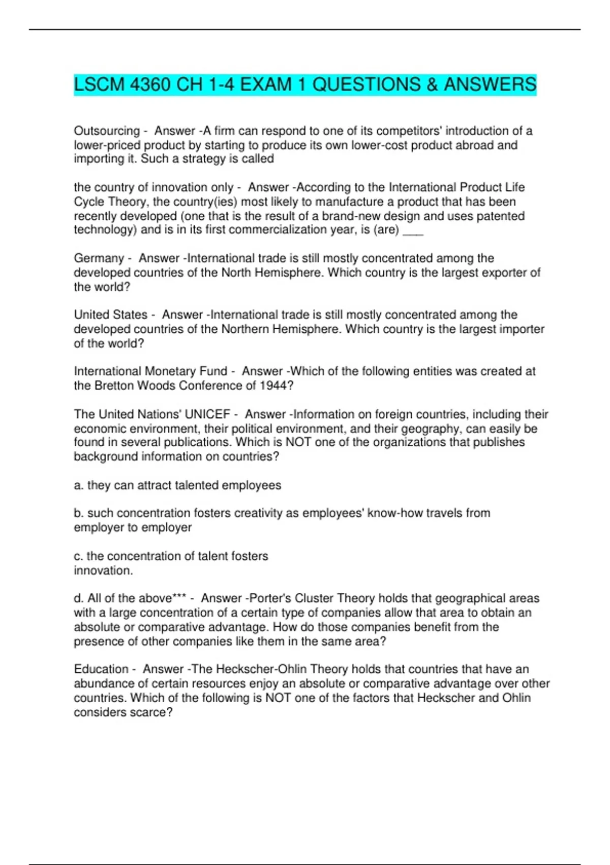 LSCM 4360 CH 1-4 EXAM 1 QUESTIONS & ANSWERS 2 Exam (elaborations) LSCM 4360 EXAM 1 & 2 QUESTIONS AND ANSWERS 3 Exam (elaborations) LSCM 4360 EXAM 1 & 2 QUESTIONS AND ANSWERS 4 Exam (elaborations) LSCM 4360 EXAM 1- 3 QUESTIONS & ANSWERS 5 Exam (elaborations) LSCM 4360- EXAM 1 QUESTIONS & ANSWERS 6 Exam (elaborations) LSCM 4360 EXAM 1 QUESTIONS