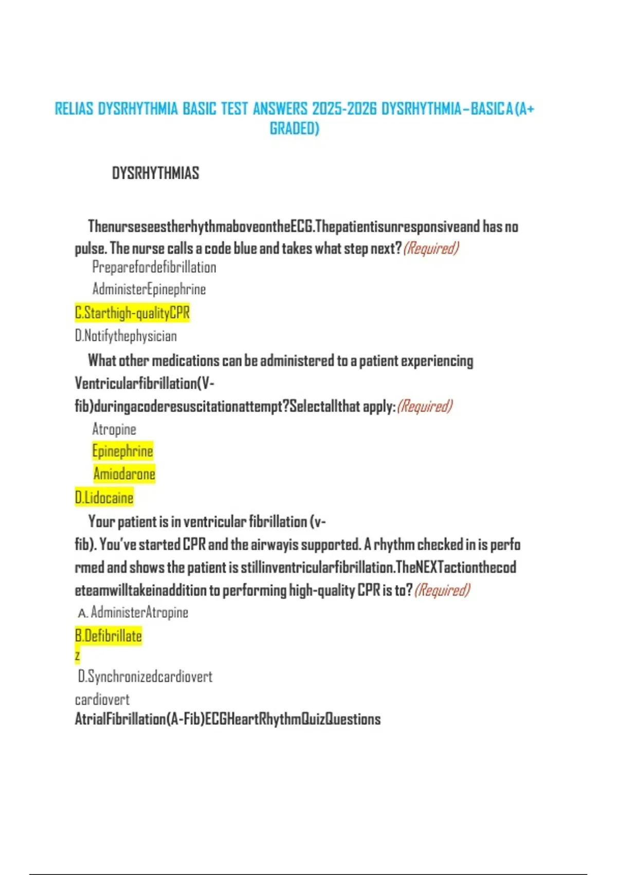 RELIASDYSRHYTHMIA BASICTESTBANK ANSWERS2025/2026 DYSRHYTHMIA–BASICB (A+GRADED)100% CORRECT