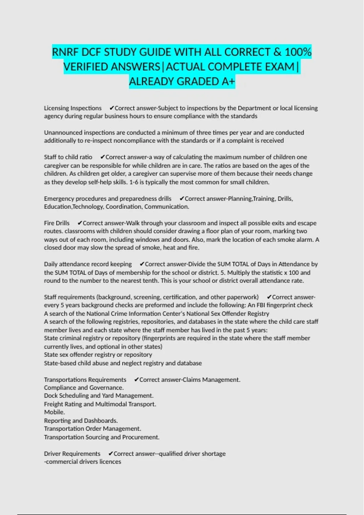 This package deal includes the full set of resources for the DCF (Department of Children and Families) Exam, featuring study guides, practice questions, and 100% verified correct answers. It covers all key modules such as child growth and development, health, safety and nutrition, behavioral observation, and rules and regulations. Designed to ensur