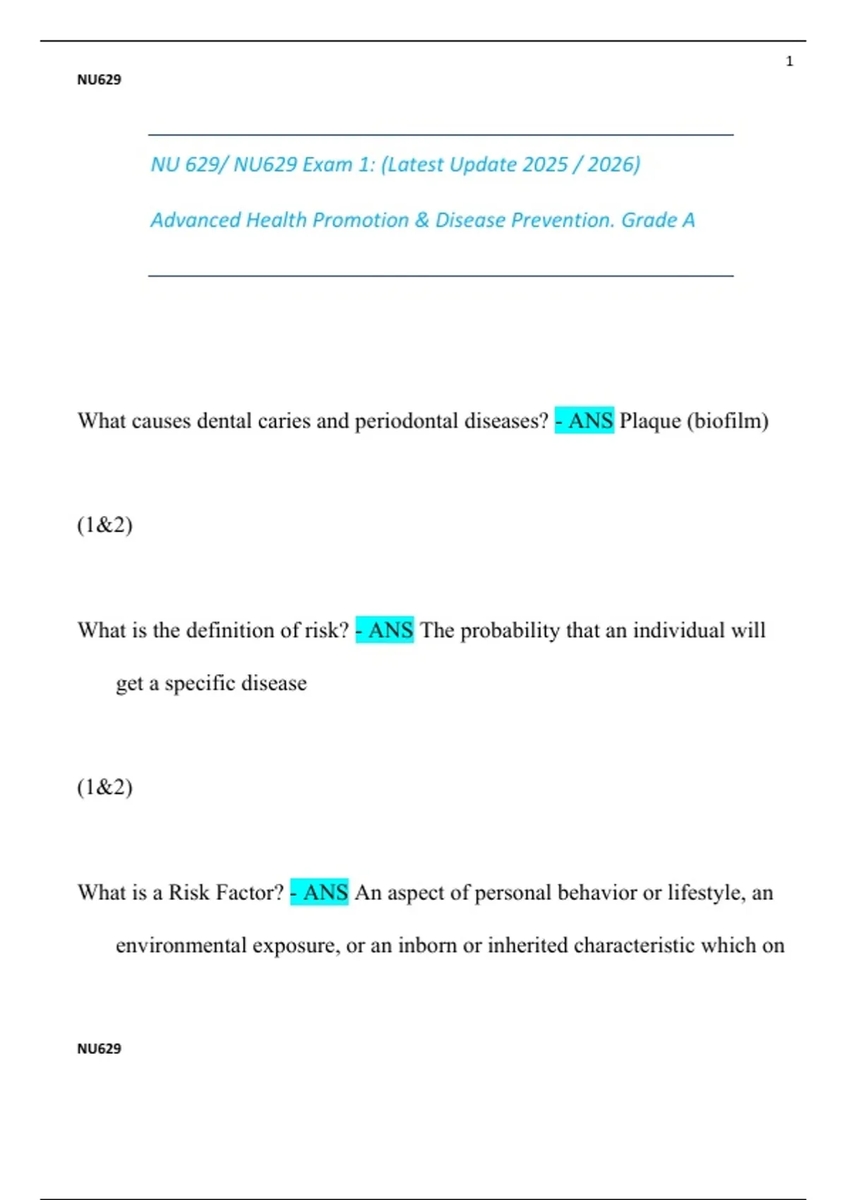 STUDENT DEAL 50% OFF!! NU 629 Exam 1, 2, 3 & FINAL Exams (Latest Update 2025 / 2026) Advanced Health Promotion & Disease Prevention