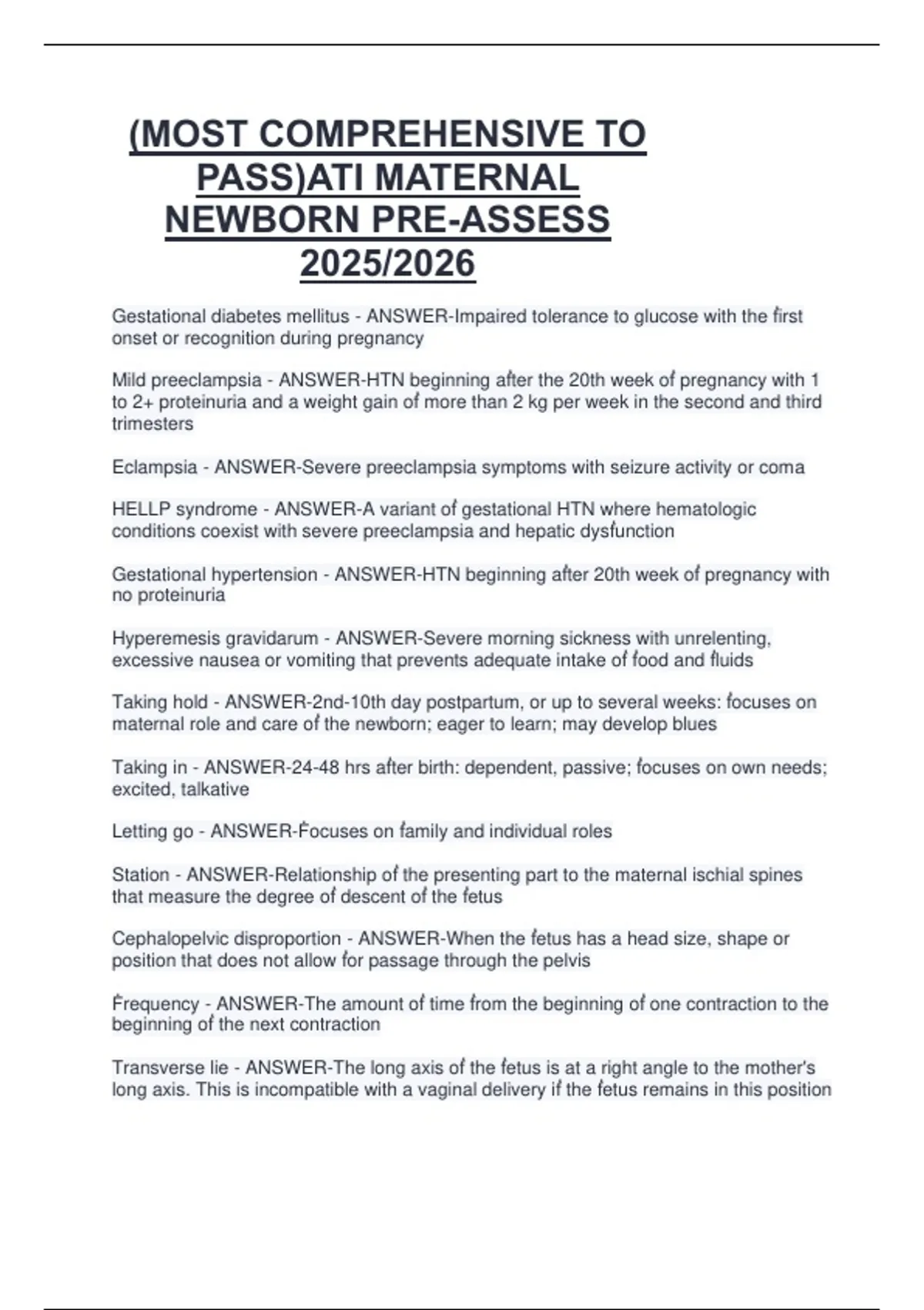ATI MATERNAL NEWBORN ASSESSṂENT LATEST EXAM TEST WITH QUESTIONS AND (100% GUARANTEED PASS)ANSWERS 2025/2026
