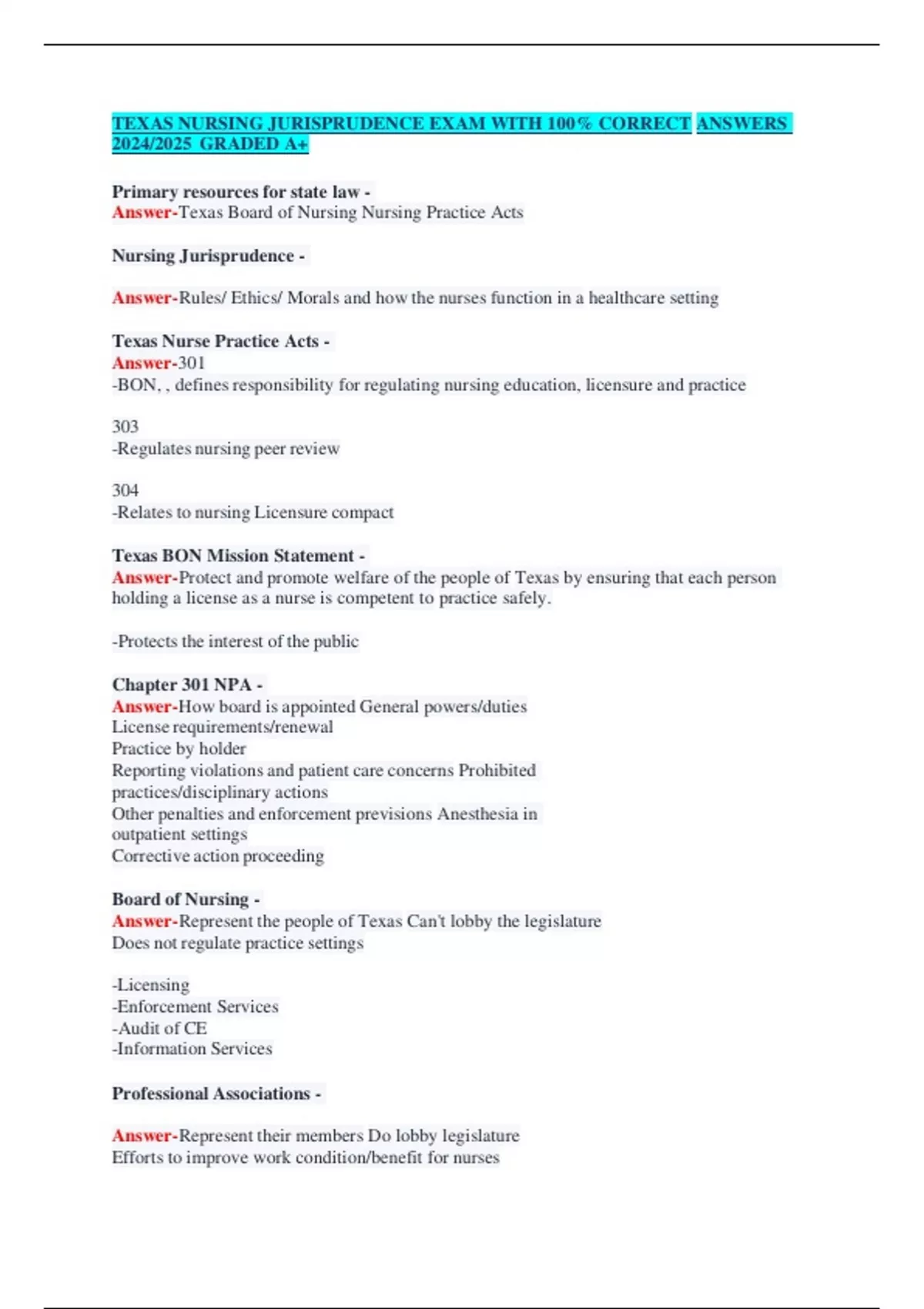 exas Jurisprudence Exam Pack – Exam 1, Midterm & Final (2025/2026) Prepare smarter and pass with confidence! This complete package includes exam-style questions with 100% correct answers, all graded A+ and fully updated. Covers Exam 1, Midterm, and Final Accurate, reliable, and comprehensive study guide Updated for 2025/2026 Texas Jurisprude