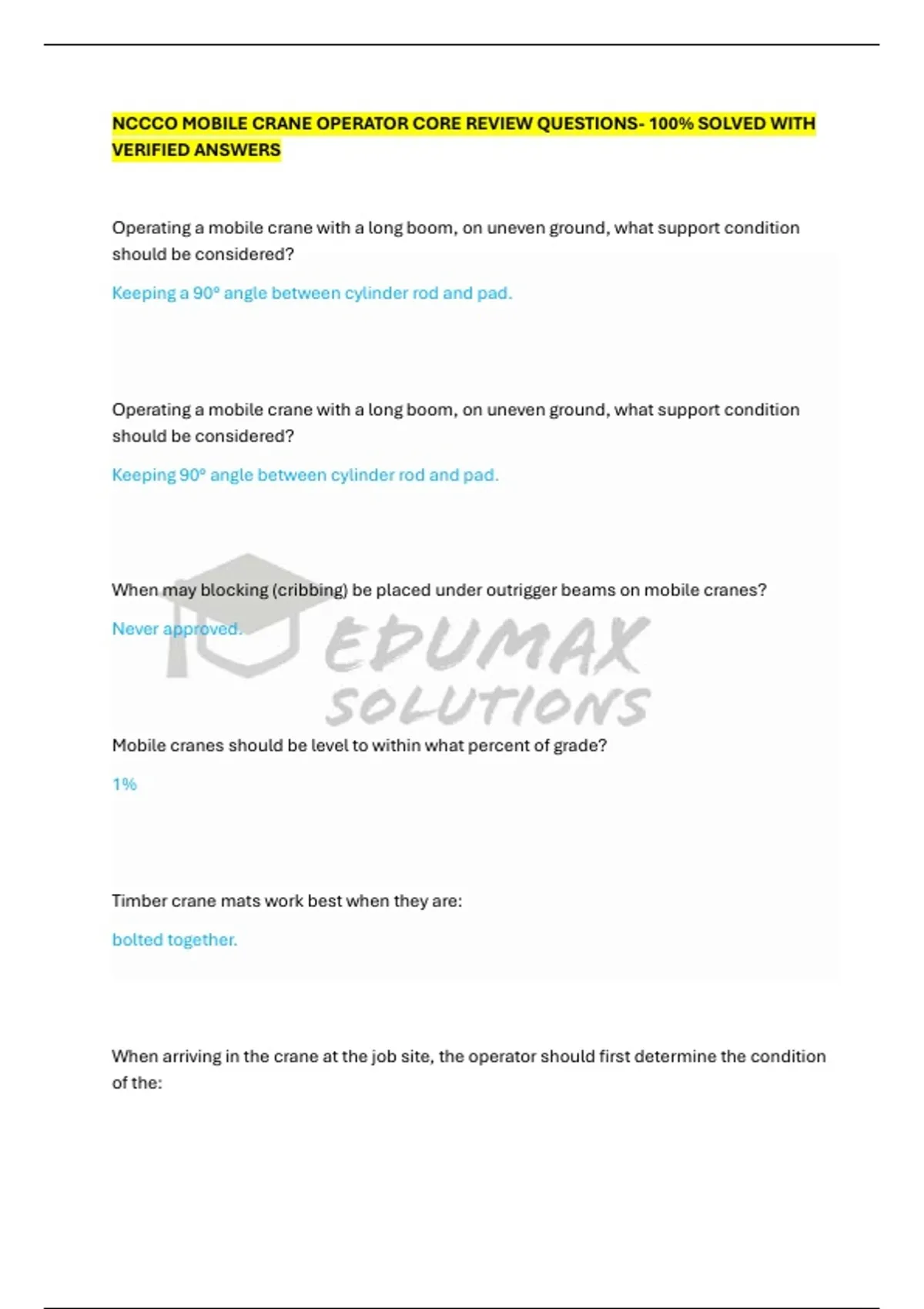 NCCCO MOBILE CRANE OPERATOR STUDY TEST 2- VERIFIED Q&A 100% SOLVED (GRADED A+)