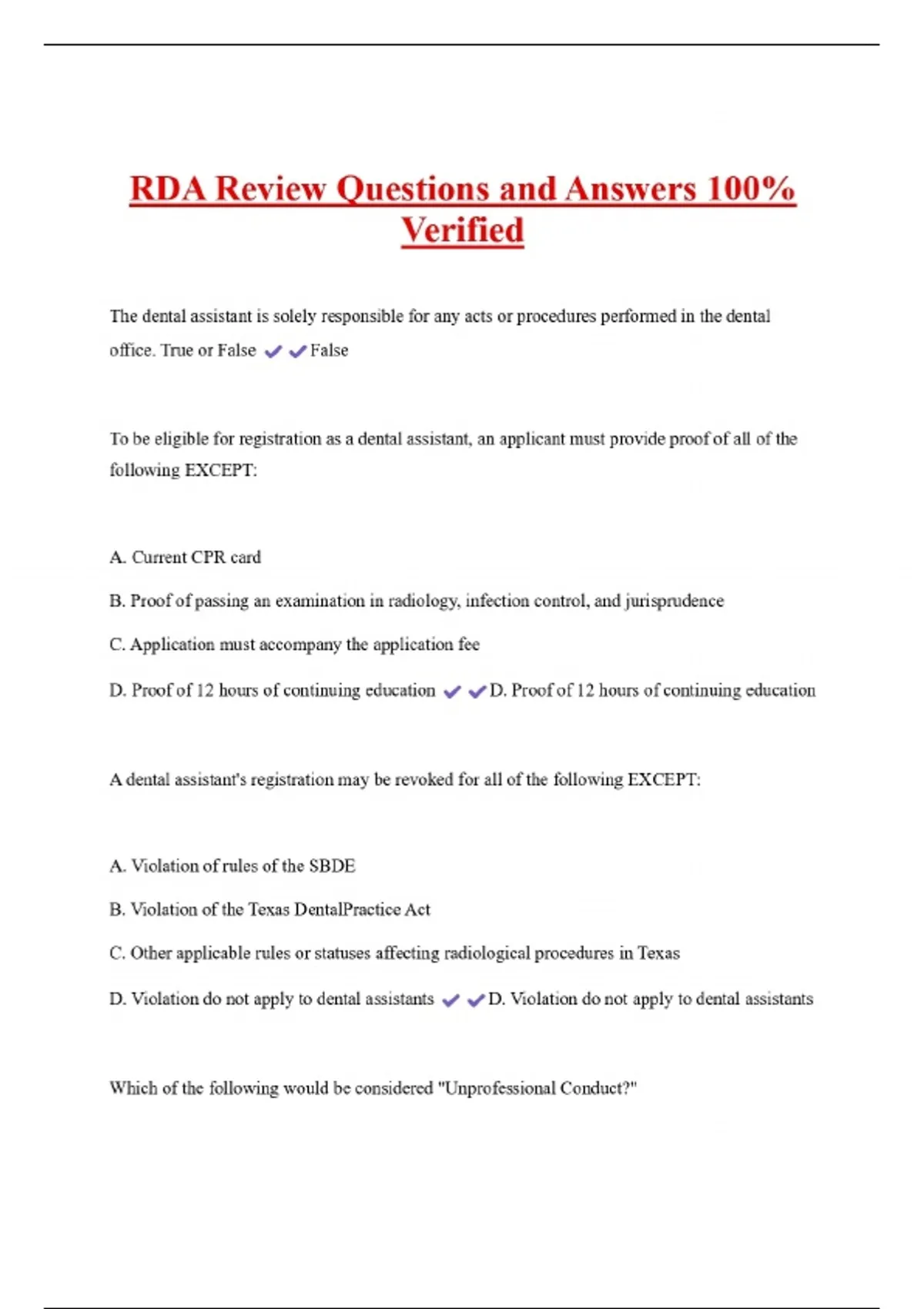 1 Exam (elaborations) RDA Review Questions and Answers 100% Verified 2 Exam (elaborations) RDA WRITTEN State Board Exam set 1 Questions and Answers Graded A+ 3 Exam (elaborations) California RDA written exam Questions and Answers|Latest Update 4 Exam (elaborations) Rda Exam Questions and Answers Verified by Experts 5 Exam (elaborations) RDA EXA