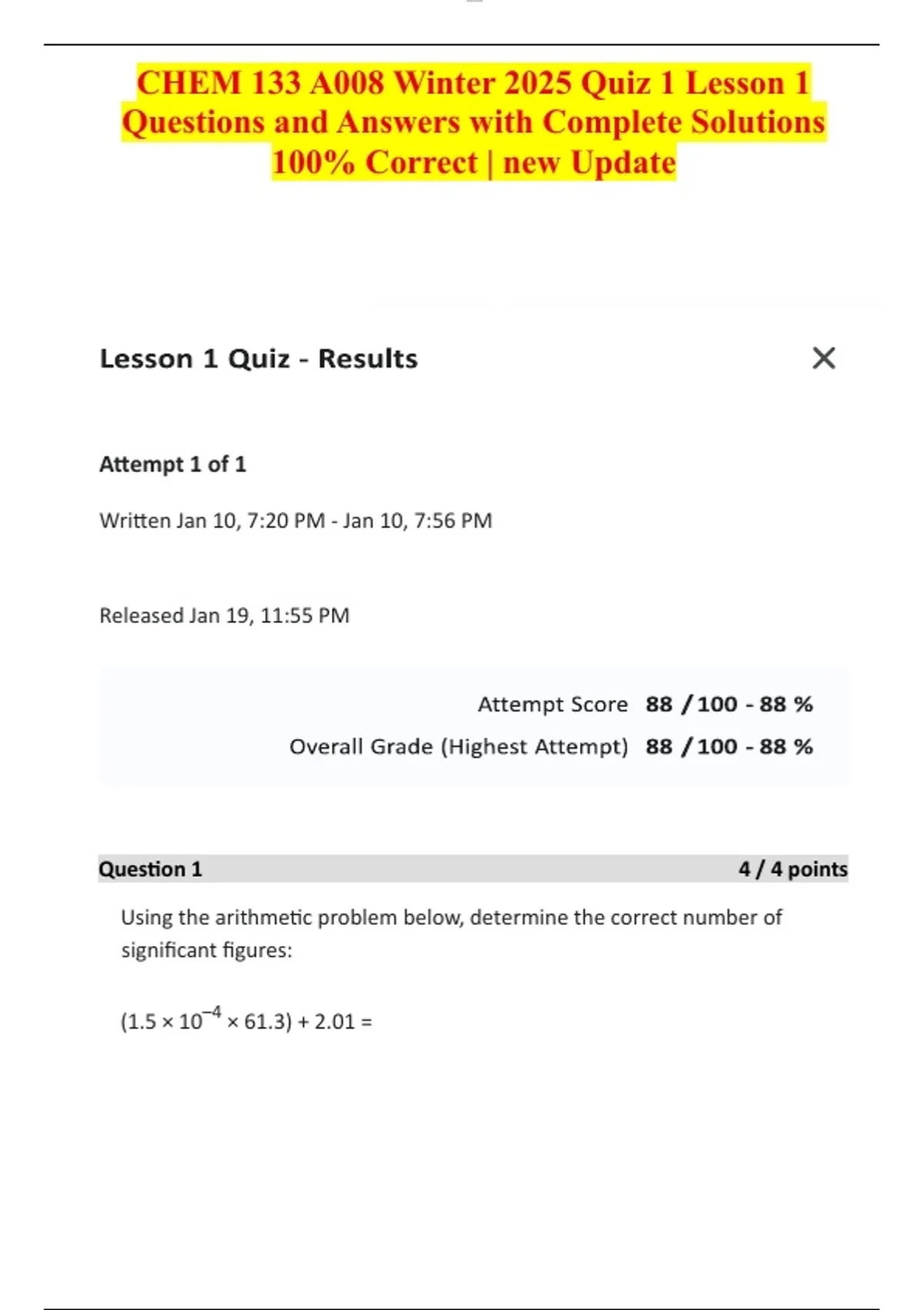 CHEM 133 A008 Winter 2025 Quiz 1 Lesson 1 Questions and Answers with Complete Solutions 100% Correct | new Update