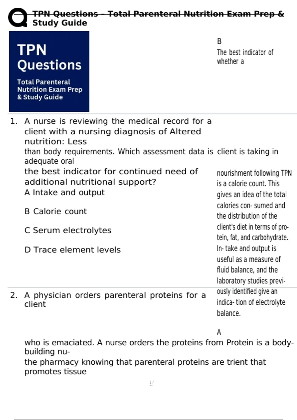 Exam (elaborations) RD Exam: Enteral & Parenteral Nutrition Study Guide Exam (elaborations) Tube Feeding & Total Parenteral Nutrition (TPN) Nursing Guide Exam (elaborations) Total Parenteral Nutrition (TPN) – Hyperalimentation Nursing Guide Exam (elaborations) Nutritional Support: PPN & TPN Nursing Exam Prep Exam (elaborations) Unit 2: Ente