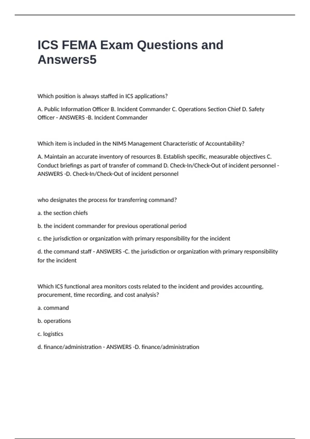 ICS FEMA Exam Questions and Answers