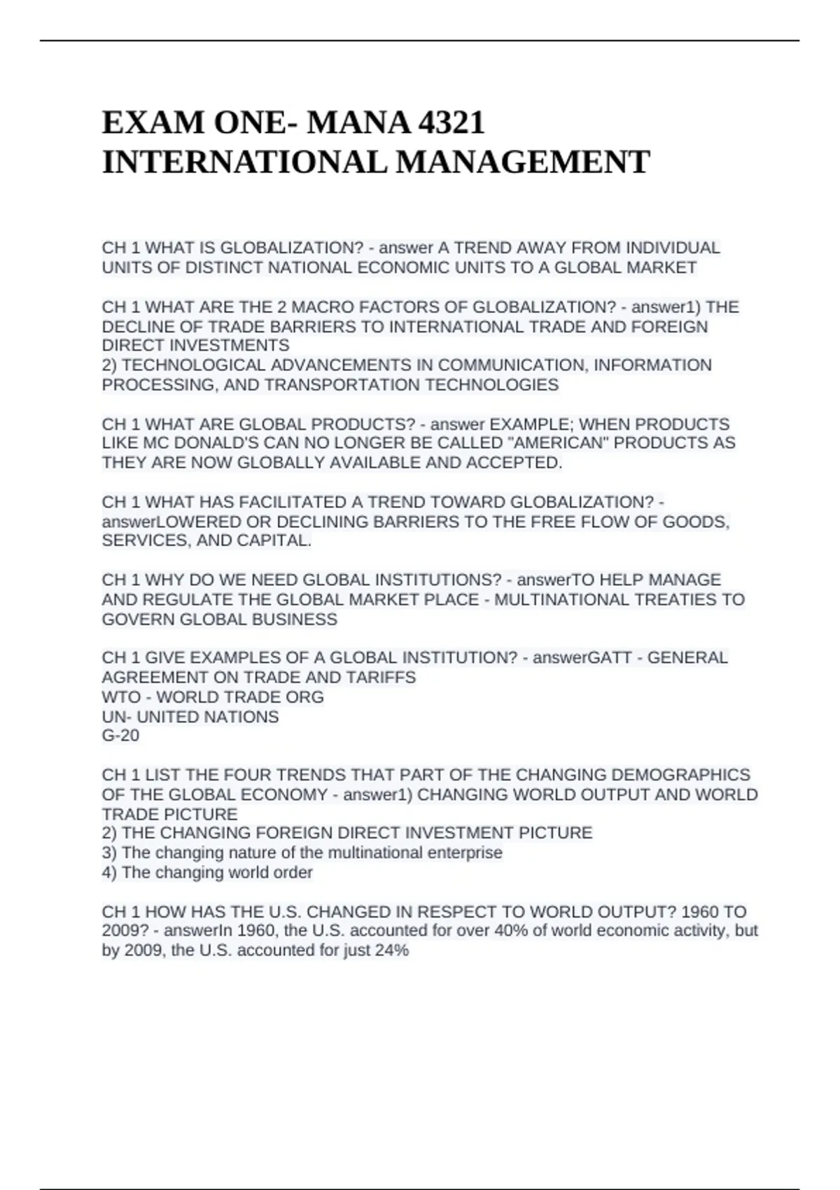 EXAM ONE- MANA 4321 INTERNATIONAL MANAGEMENT QUESTIONS WITH CORRECT ANSWERS