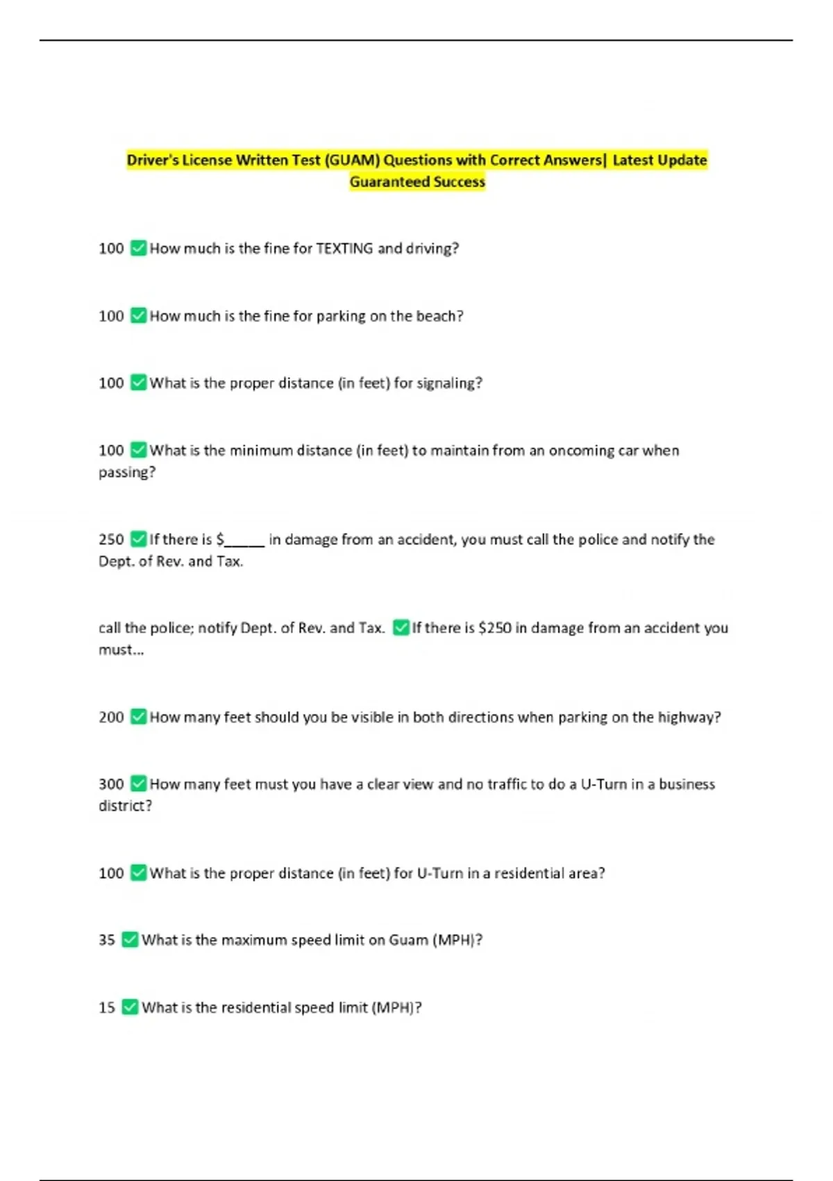 Guam Driver's License Test Questions with Correct Answers| Latest Update Guaranteed Success
