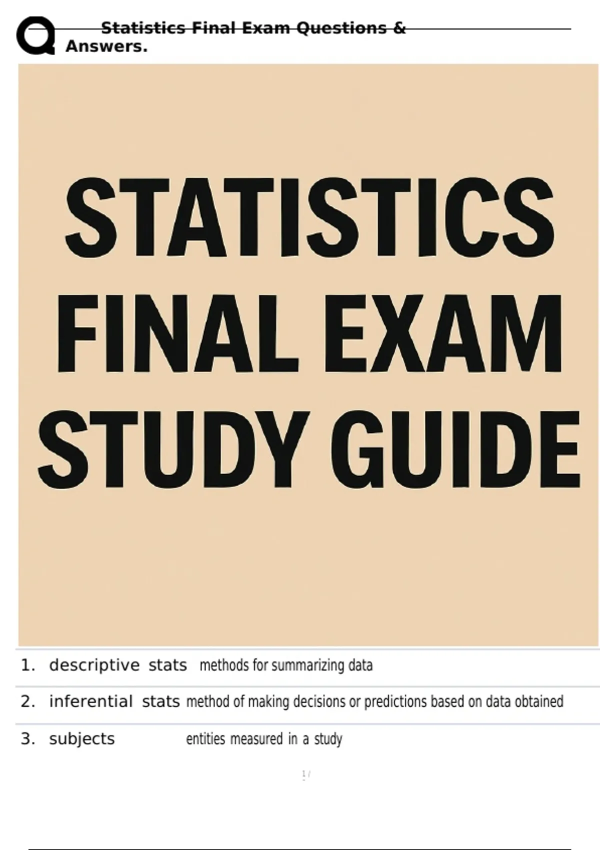 Exam (elaborations) Stats 2300 Exam 1 – Texas Tech University Exam (elaborations) Statistics Exam 1 Study Guide: Key Formulas & Practice Exam (elaborations) Research Methods and Stats Test Exam (elaborations) Probability and Statistics Final Exam Study Guide Exam (elaborations) LSU Statistics Exam 1 Test Bank – Practice Questions & Study Gu