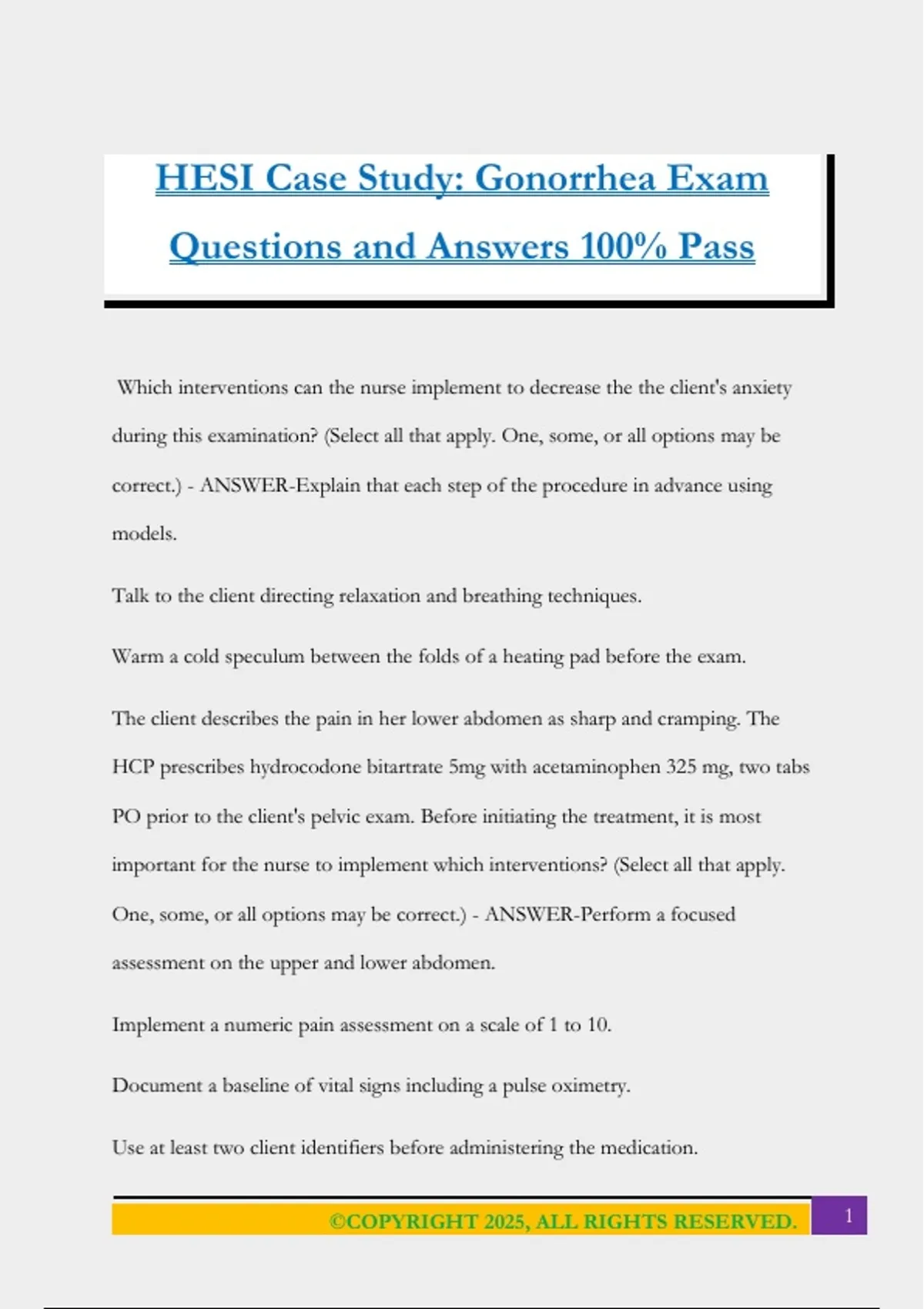 HESI Case Study: Gonorrhea Exam Questions and Answers 100% Pass