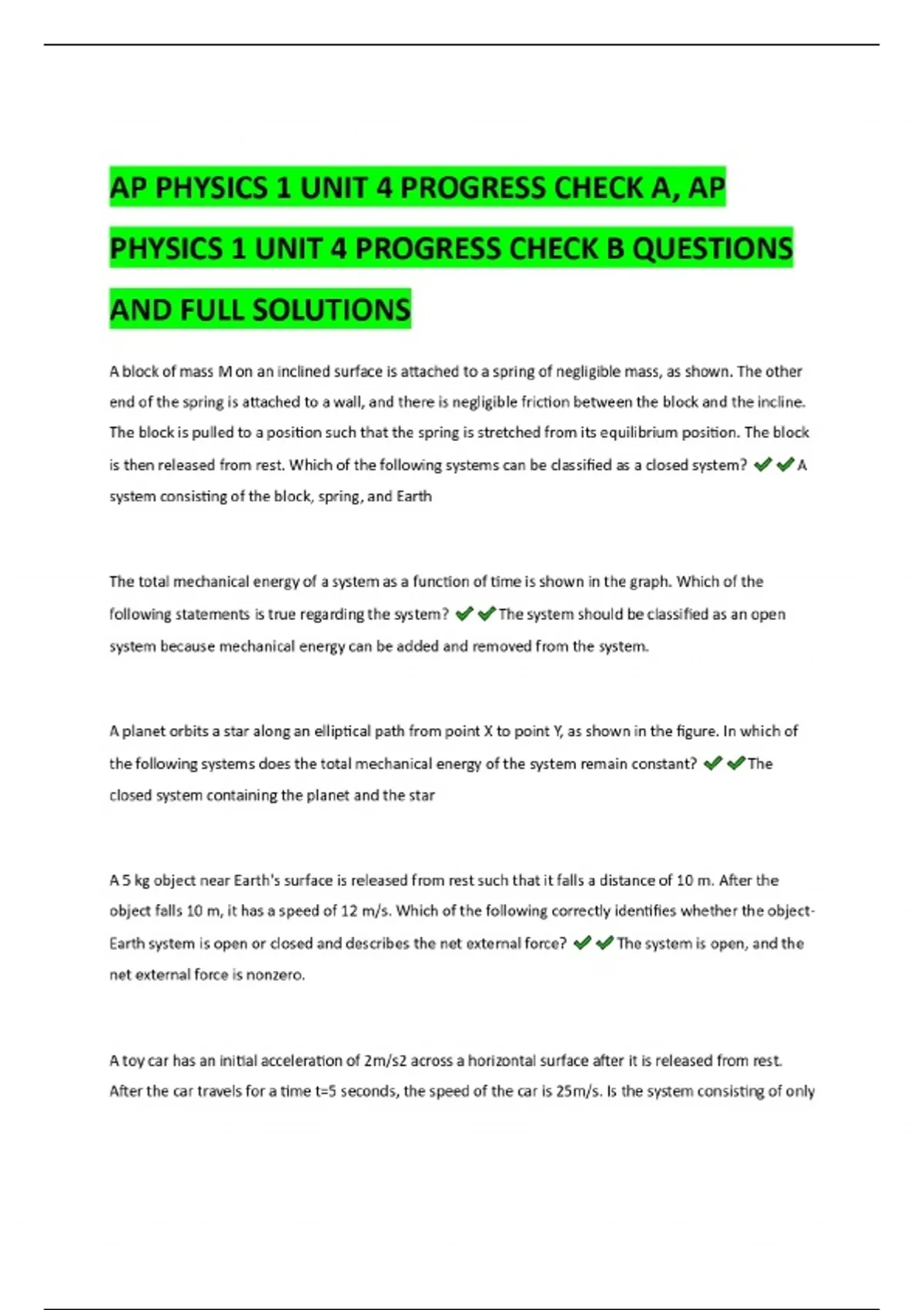 AP PHYSICS 1 UNIT 4 PROGRESS CHECK A, AP PHYSICS 1 UNIT 4 PROGRESS CHECK B QUESTIONS AND FULL SOLUTIONS