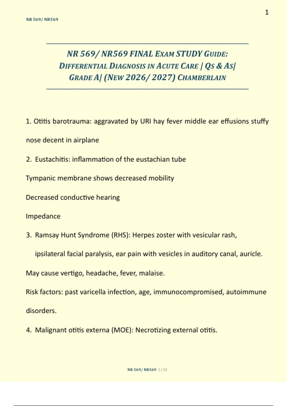 STUDY PACK!! NR 569 FINAL EXAMs COMPILATION: DIFFERENTIAL DIAGNOSIS IN ACUTE CARE |
