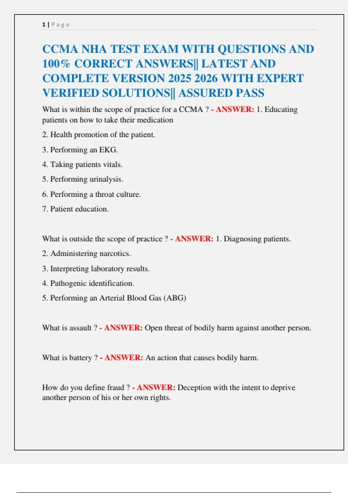 NHA CCMA MEDICAL ASSISTANT CERTIFICATION EXAMS PACKAGE WITH QUESTIONS AND 100% CORRECT ANSWERS|| LATEST AND COMPLETE VERSION WITH EXPERT VERIFIED SOLUTIONS|| ASSURED PASS