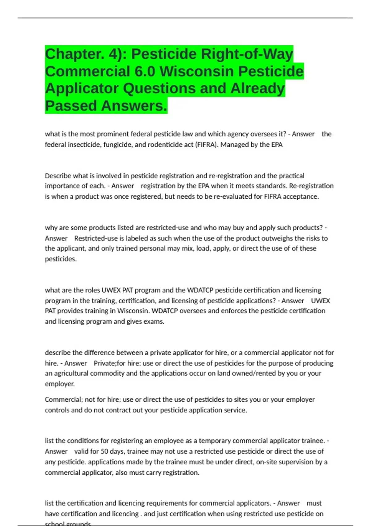 Wisconsin Pesticide Applicator Exam () Reviewed Package Deal Bundle Scored A+.
