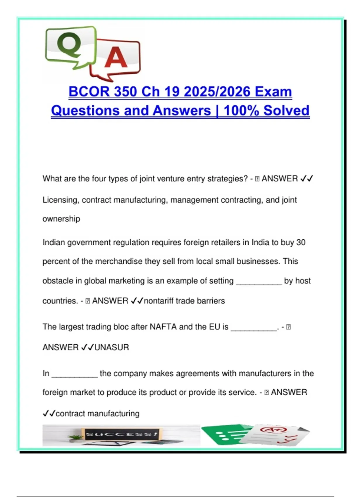 BCOR 350 – Chapter 19 Exam Q&A (2025/2026) | 30+ Solved Questions | Global Marketing, Entry Strategies, WTO | West Virginia University